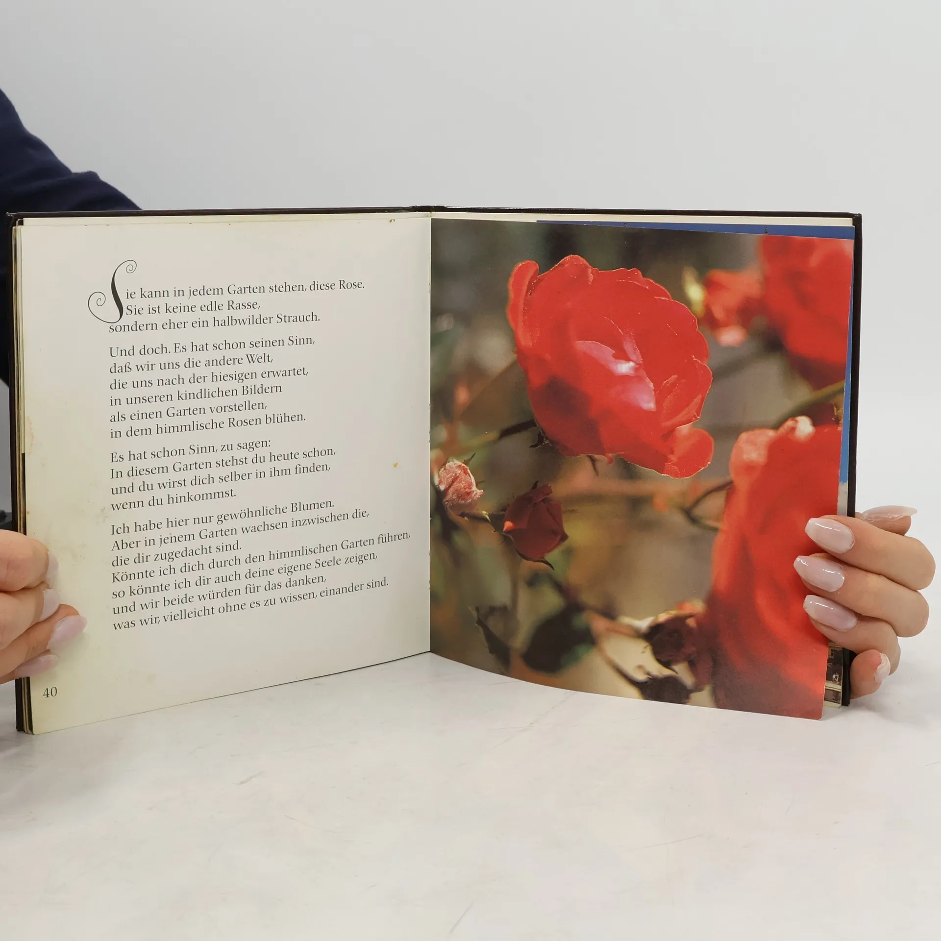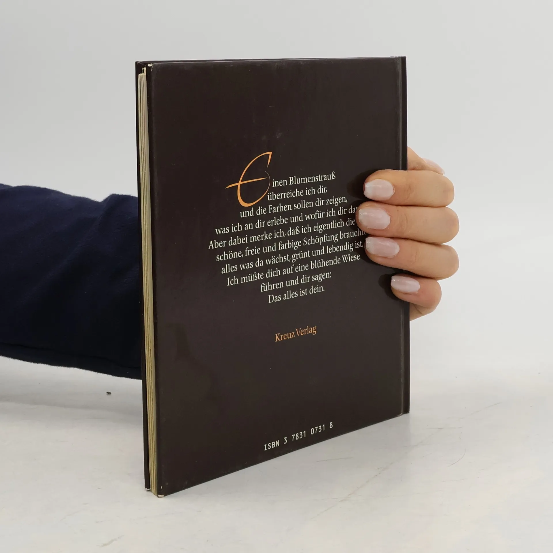 From the back Einen Blumenstrauß überreiche ich dir, und die Farben sollen dir zeigen, was ich an dir erlebe und wofür ich dir danke. Aber dabei merke ich, daß ich eigentlich die ganze schöne, freie und farbige Schöpfung brauchte, alles was da wächst, grunt und lebendig ist. Ich müßte dich auf eine blühende Wiese führen und dir Das alles ist dein.