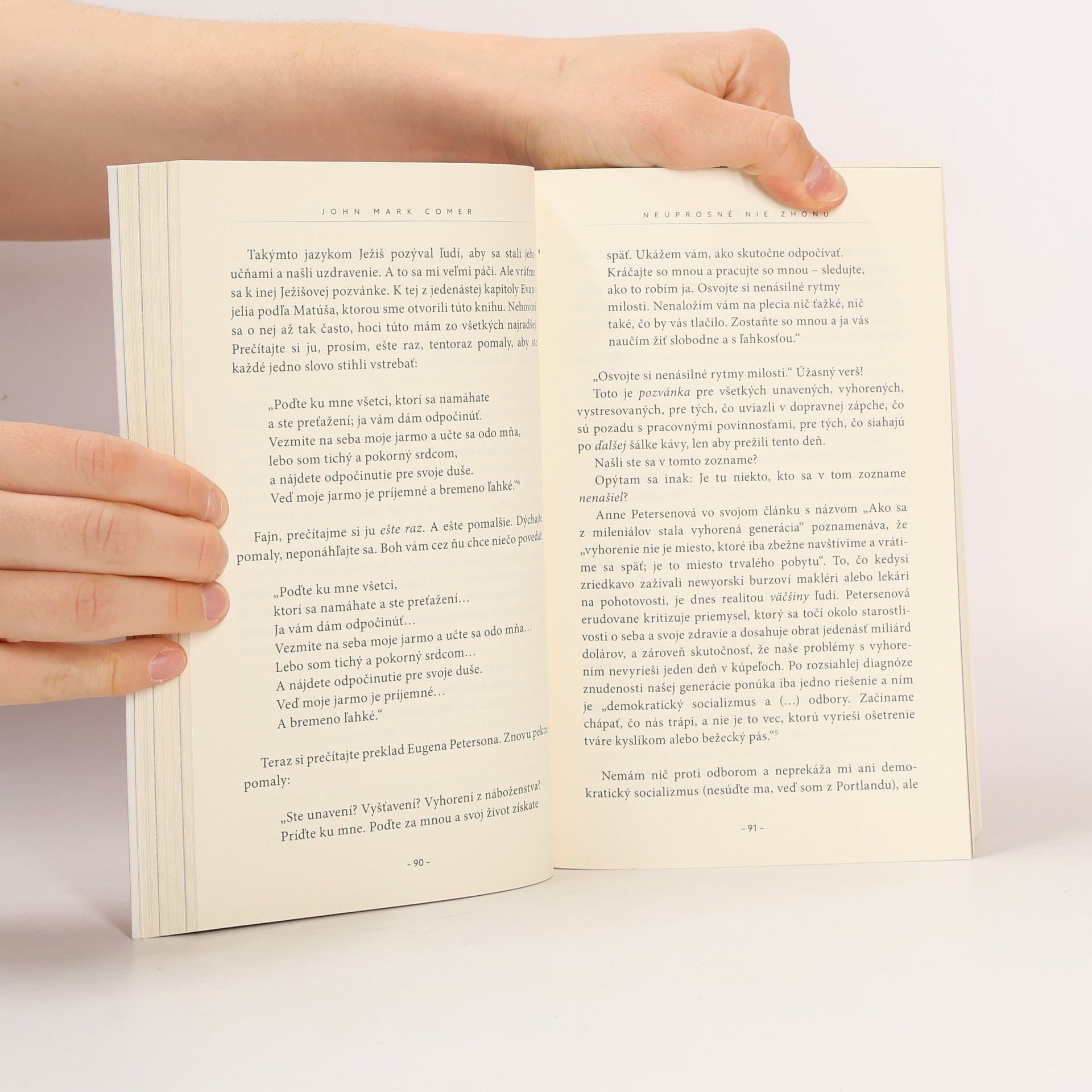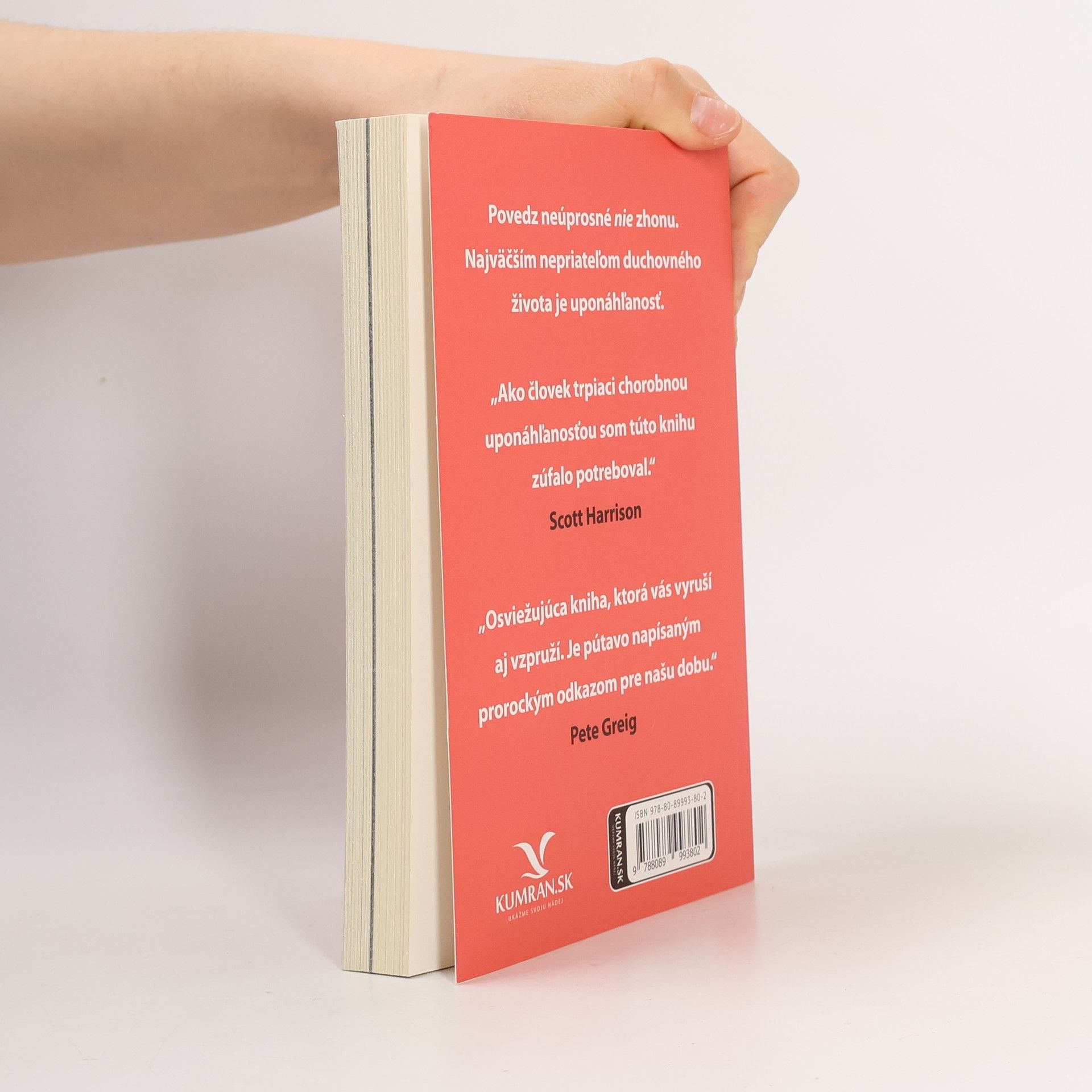 Aký človek sa to zo mňa stáva? Táto otázka znepokojovala pastora a spisovateľa Johna Marka Comera. Navonok síce pôsobil ako úspešný človek, no v jeho vnútri nebolo všetko v poriadku. A tak sa s prosbou o radu obrátil na dôveryhodného mentora, od ktorého si vypočul tieto slová: „Povedz neúprosné nie zhonu. Najväčším nepriateľom duchovného života je uponáhľanosť.“ Takú odpoveď síce nečakal, ale dodnes sa presviedča o tom, že práve to potreboval. Namiesto toho, aby sme sa pokúsili presne pomenovať príčinu toxicity moderného sveta, mnohokrát iba riešime symptómy. Čoraz častejšie zaznievajú hlasy, ktoré za koreň veľkej časti zla považujú práve zhon a zaneprázdnenosť. Na stránkach tejto knihy nájdete pôsobivý návod, ako si v chaose moderného sveta udržať emočné zdravie a duchovný život. Presvedčivé dôkazy proti uponáhľanosti a v prospech jednoduchšieho, pomalšieho života.