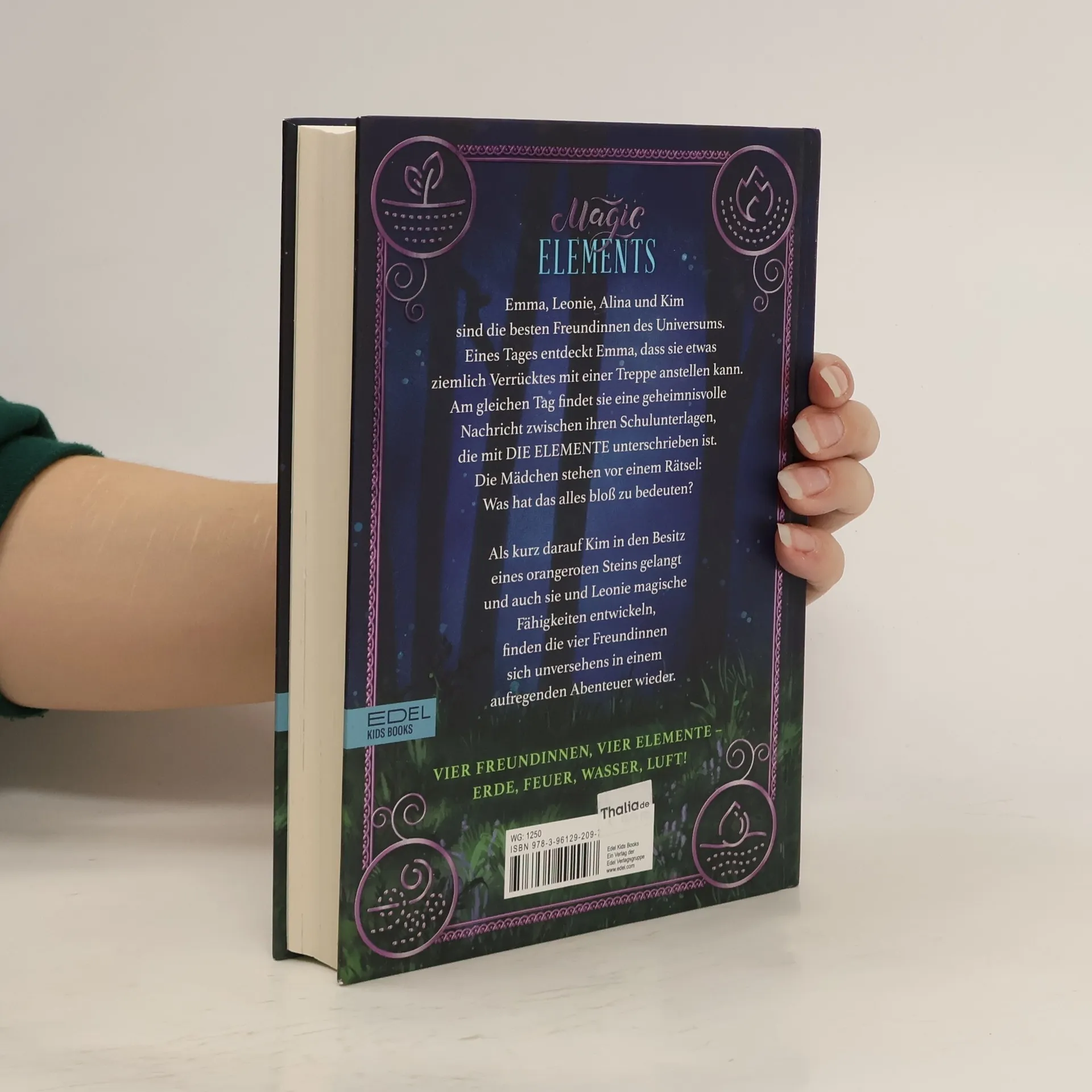 Magic Elements: Vier Freundinnen, vier Elemente – Erde, Feuer, Wasser, Luft! Emma, Leonie, Alina und Kim sind die besten Freundinnen des Universums. Eines Tages entdeckt Emma, dass sie etwas ziemlich Verrücktes mit einer Treppe anstellen kann. Am gleichen Tag findet sie eine geheimnisvolle Nachricht zwischen ihren Schulunterlagen, die mit DIE ELEMENTE unterschrieben ist. Die Mädchen stehen vor einem Rätsel: Was hat das alles bloß zu bedeuten? Als kurz darauf Kim in den Besitz eines orangeroten Steins gelangt und auch sie und Leonie magische Fähigkeiten entwickeln, finden die vier Freundinnen sich unversehens in einem aufregenden Abenteuer wieder. Doch schon bald müssen sie sich einem mächtigen Gegner stellen. Kim wird entführt und Emma und Leonie stoßen bei ihrem Befreiungsversuch schnell an ihre Grenzen. Doch was ist mit Alina, die als Einzige noch kein besonderes Talent an sich an entdeckt hat? Kann womöglich ausgerechnet sie ihren Freundinnen helfen und Kim retten?