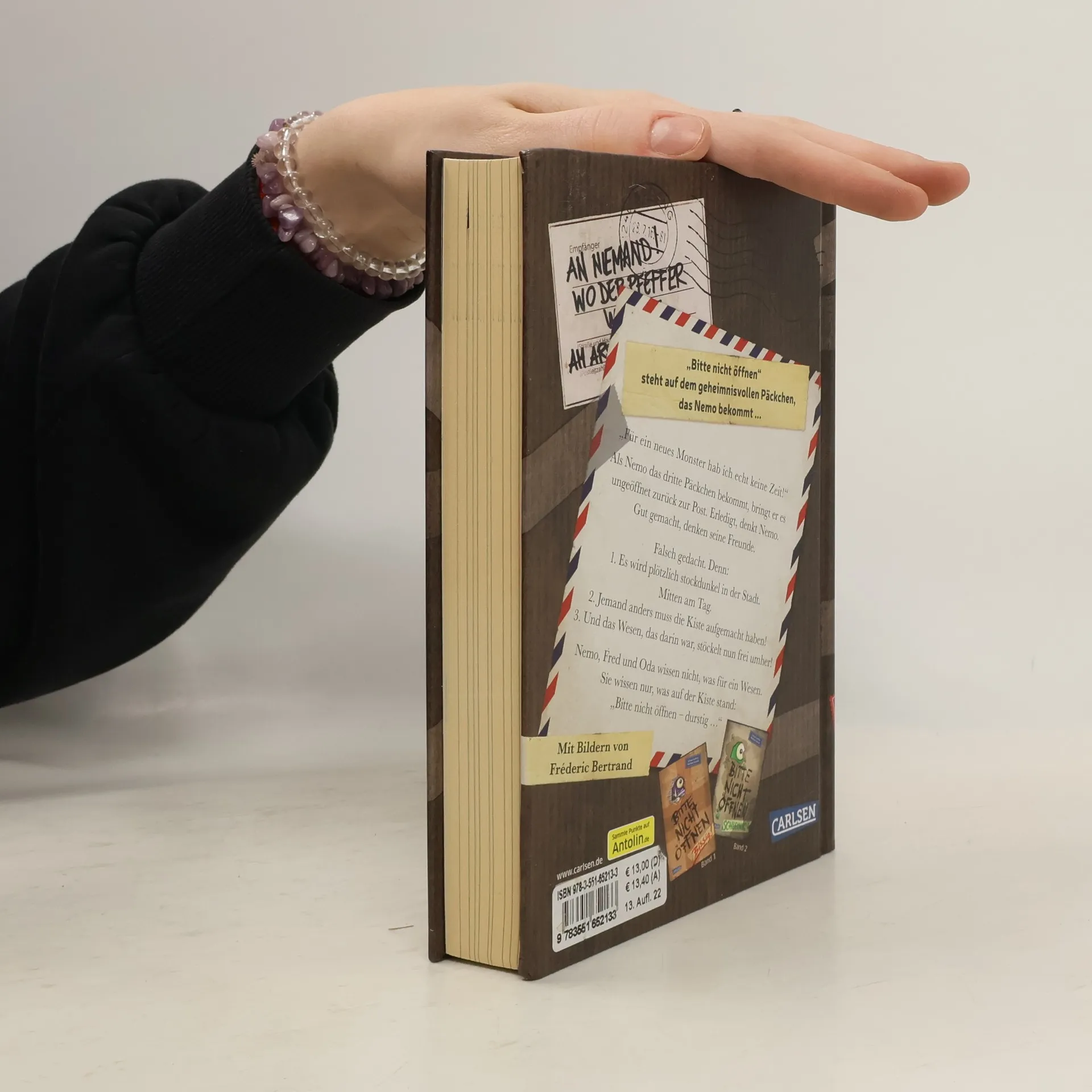 "Bitte nicht öffnen!" steht auf dem geheimnisvollen Päckchen, das Nemo bekommt. Also macht Nemo es auf ...BITTE NICHT ÖFFNEN, BAND 3: „Für ein neues Monster hab ich echt keine Zeit!“ Als Nemo das dritte Päckchen bekommt, bringt er es ungeöffnet zurück zur Post. Erledigt, denkt Nemo. Gut gemacht, denken seine Freunde. Falsch gedacht. Denn: 1. Es wird plötzlich stockdunkel in der Stadt. Mitten am Tag.2. Jemand anders muss die Kiste aufgemacht haben!3. Und das Wesen, das darin war, stöckelt nun frei umher!Nemo, Fred und Oda wissen nicht, was für ein Wesen. Sie wissen nur, was auf der Kiste stand: „Bitte nicht öffnen – durstig …“Nach dem Kinderbuch-Bestseller-Erfolg von Band 1 und 2 nun endlich da: ein neues lustiges und turbulentes Abenteuer rund um Schule, Freundschaft und ein verlorenes Wesen, das nach Hause will! ***Voller überraschender Wendungen, Sprachwitz und mit vielen Bildern vom unverwechselbaren Fréderic Bertrand. ***Das perfekte Buch für Jungs und Mädchen – und ihre Eltern! ***