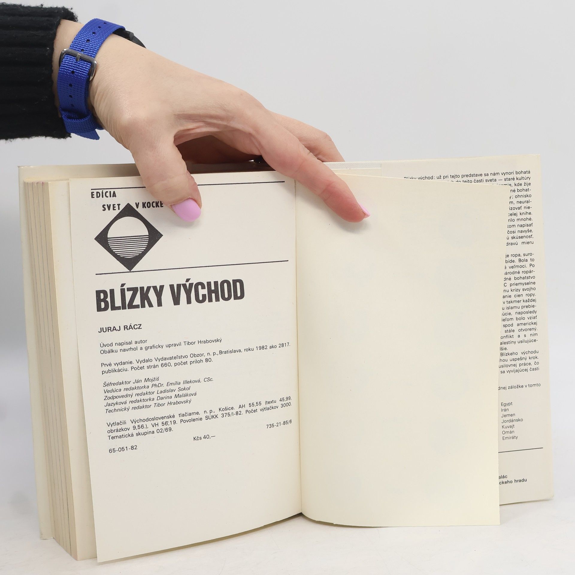 Rozsiahla publikácia z edície Svet v kocke prináša profily blízkovýchodných štátov (Bahrajn, Egypt, Iran, Irak, Izrael, Palestína, Jemen, Jordánsko, Katar, Kuvajt, Libanon, Omán, Saudská Arábia, Spojené arabské emiráty a Sýria) v situácii, v akej sa nachádzal tento región v 70. rokoch 20. storočia. Knihu doplňuje štúdia o histórii Blízkého východu, ďalej slovníček pojmov a výrazov a súvisiaca literatúra. Početné ilustrácie, mapy, vyobrazenie vlajok a platidiel (80 príloh). I. vydanie.