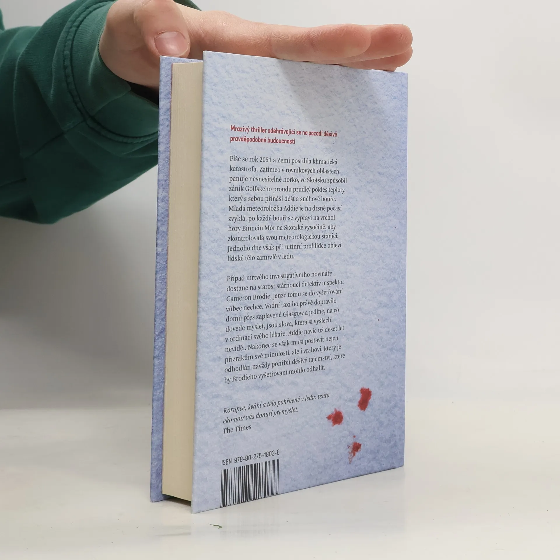 Mrazivý thriller odehrávající se na pozadí děsivě pravděpodobné budoucnosti. Píše se rok 2051 a Zemi postihla klimatická katastrofa. Zatímco v rovníkových oblastech panuje nesnesitelné horko, ve Skotsku způsobil zánik Golfského proudu prudký pokles teploty, který s sebou přináší déšť a sněhové bouře. Mladá meteoroložka Addie se po každé bouři se vypraví na vrchol hory Binnein Mňr na Skotské vysočině, aby zkontrolovala svou meteorologickou stanici. Jednoho dne však při rutinní prohlídce objeví lidské tělo zamrzlé v ledu. Případ mrtvého investigativního novináře dostane na starost stárnoucí detektiv inspektor Cameron Brodie, jenže tomu se do vyšetřování vůbec nechce. Nakonec se však musí postavit nejen přízrakům své minulosti, ale i vrahovi, který je odhodlán navždy pohřbít děsivé tajemství, které by Brodieho vyšetřování mohlo odhalit. Nakladatelská anotace. Kráceno.