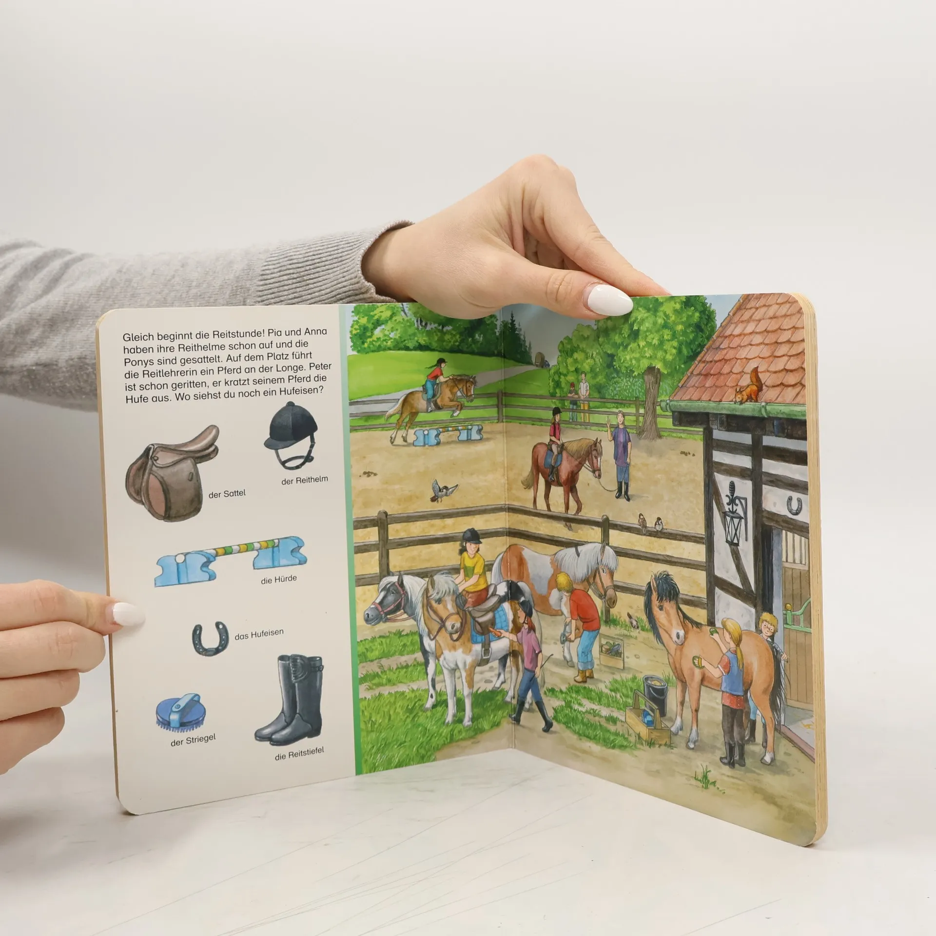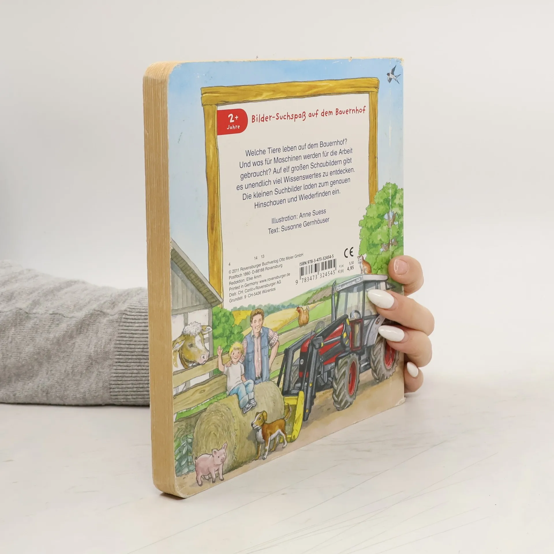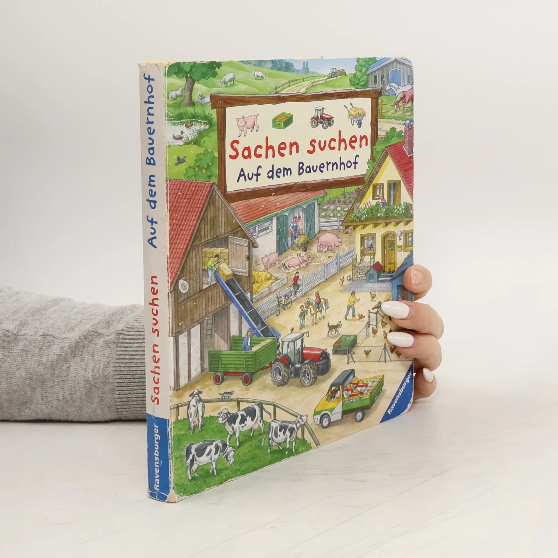Ein Wimmelbuch-Suchspaß-Titel aus der beliebten „Sachen suchen“-Reihe. Auf dem Bauernhof gibt es viel zu tun: Äcker umgraben, Getreide und Gemüse ernten, Wiesen mähen und sich um die Tiere wie Kühe, Schafe, Hühner, Pferde, Schweine und Kaninchen kümmern. Im Hofladen kann man frisches Gemüse, Eier und Milch direkt vom Bauernhof kaufen. Die farbenprächtigen Suchbilder zeigen Landmaschinen wie Traktoren, Heuwender und Mähdrescher im Einsatz. Altersgerechte Sachbuchtexte begleiten die detailgetreuen Illustrationen und machen dieses Ravensburger Pappbilderbuch zu einem dauerhaften Begleiter für kleine Bauernhof-Entdecker ab 2 Jahren. Auf 11 großen Suchbildern werden der Bauernhof und die Menschen und Tiere, die dort leben und arbeiten, vorgestellt. Kurze Sachtexte ergänzen die Bilder. Jede Doppelseite zeigt eine Suchleiste, in der kleine Fans Tiere, Landmaschinen, Gemüse und andere Details suchen können. Kleine Suchaufträge bieten erste Erfolgserlebnisse. Die robusten Pappbilderbuchseiten mit abgerundeten Ecken sind ideal für Kleinkinderhände. Geprüfte Sicherheit, hochwertige Materialien und altersgerechte Inhalte machen dieses Buch zum Lieblingsbuch für neugierige Entdecker. Es enthält detailreiche Suchbilder über die Arbeit auf dem Bauernhof, die Ernte, Ponyreiten und mehr.