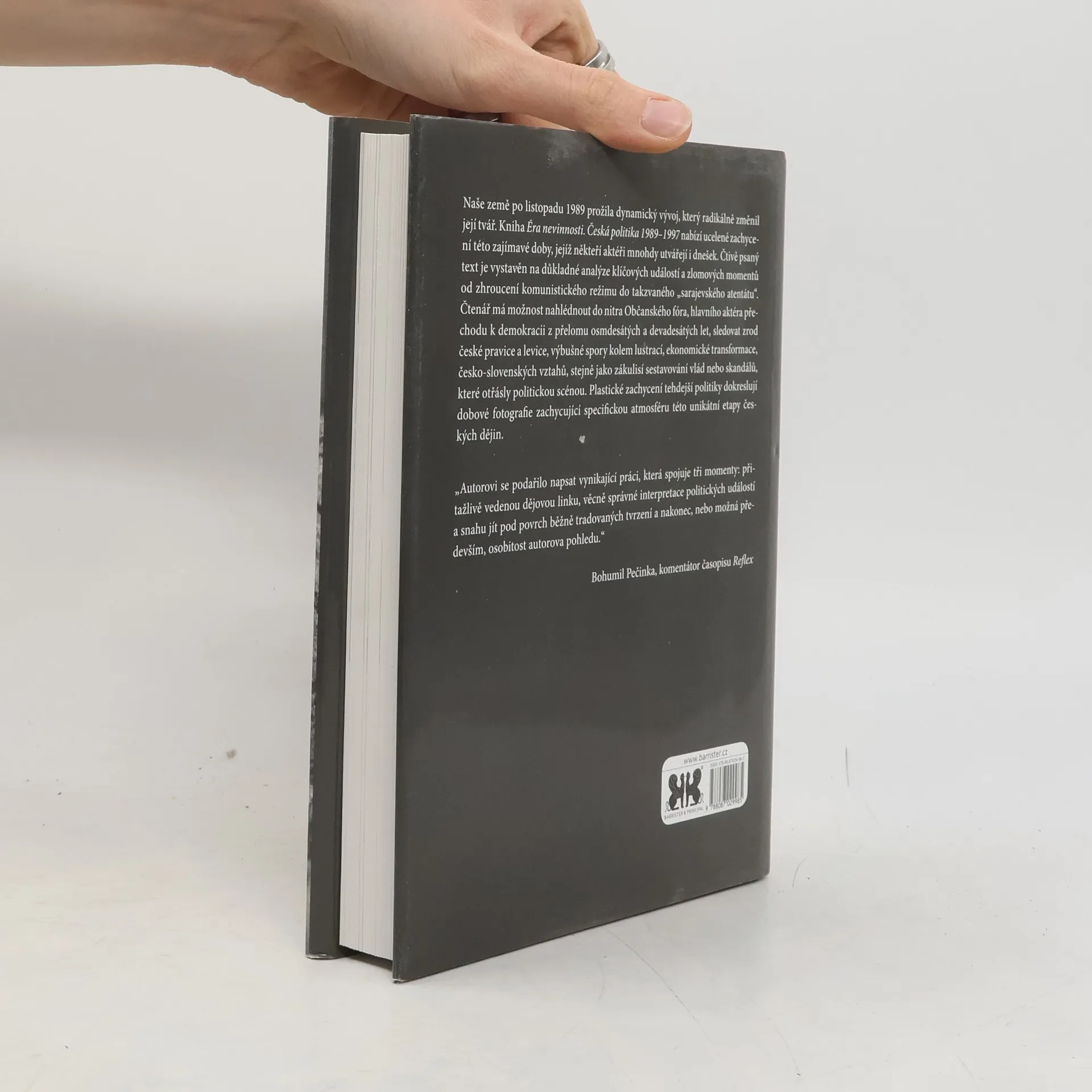 Česká politika 1989-1997. Naše země po listopadu 1989 prožila dynamický vývoj, který radikálně změnil její tvář. Kniha Éra nevinnosti. Česká politika 1989-1997 nabízí ucelené zachycení této zajímavé doby, jejíž někteří aktéři mnohdy utvářejí i dnešek. Čtivě psaný text je vystavěn na důkladné analýze klíčových událostí a zlomových momentů od zhroucení komunistického režimu do takzvaného \"sarajevského atentátu\". Čtenář má možnost nahlédnout do nitra Občanského fóra, hlavního aktéra přechodu k demokracii z přelomu osmdesátých a devadesátých let, sledovat zrod české pravice a levice, výbušné spory kolem lustrací, ekonomické transformace, česko-slovenských vztahů, stejně jako zákulisí sestavování vlád nebo skandálů, které otřásly politickou scénou. Plastické zachycení tehdejší politiky dokreslují dobové fotografie zachycující specifickou atmosféru této unikátní etapy českých dějin.