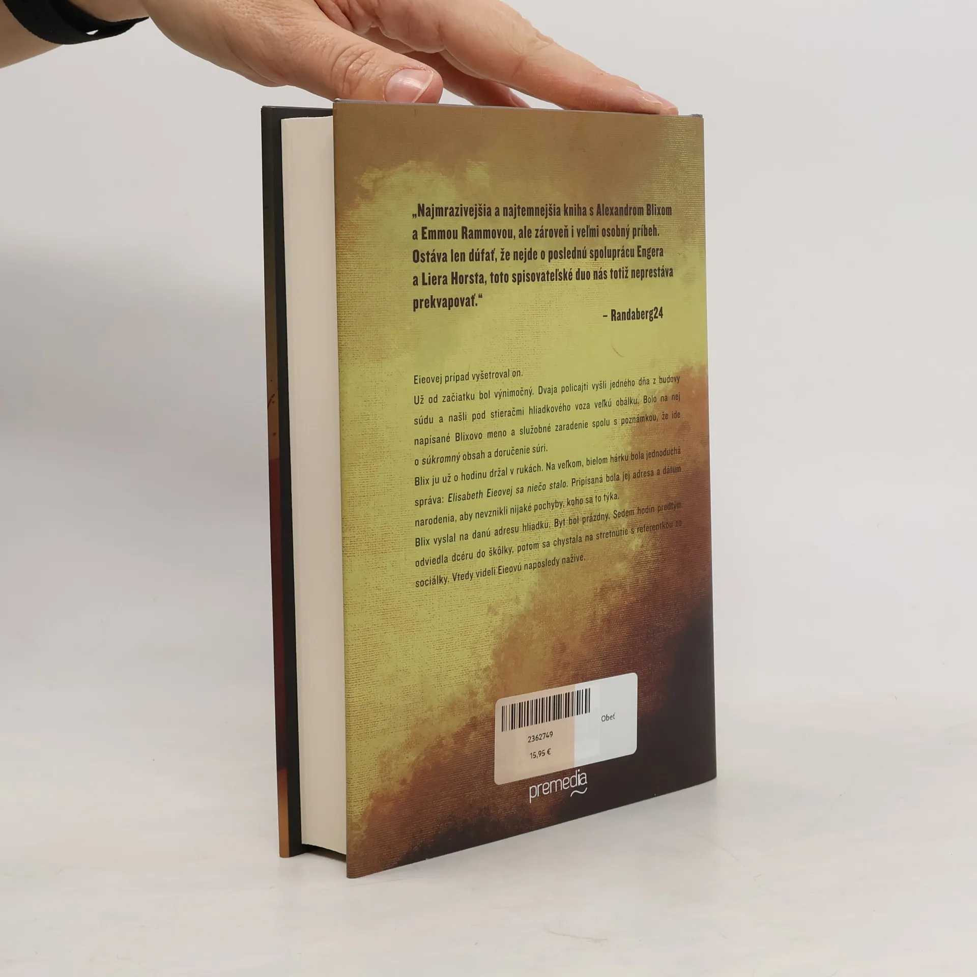 Piaty diel série, ktorá sa v Nórsku stáva fenoménom. Alexander Blix pracoval pred dvomi rokmi na prípade zmiznutia Elisabeth Eieovej. Vyšetrovanie sa zastavilo, keď bola zavraždená jeho dcéra a dlho to vyzeralo tak, že nikto nikdy nevypátra, čo sa Elisabeth prihodilo. Čo ak sa však náhle ozve niekto, kto to vie? A čo znamená, že nielenže vie, čo sa stalo po jej zmiznutí, ale ovláda i detaily z Blixovho života? Medzitým Emmu kontaktuje neznáme mladé dievča. Carmeninho otčima zadržali, podozrievajú ho z vraždy kamarátky z detstva. Polícia však nemá telo. A ani iných potenciálnych páchateľov. Kruh udalostí uzatvára nečakaný nález na detskej kresbičke z jedného miesta činu – prítomnosť sa dostáva do kontaktu s minulosťou. A tam, v bode, kde sa pretínajú, si obeť nachádza svoju vlastnú, jedinečnú formu terapie.