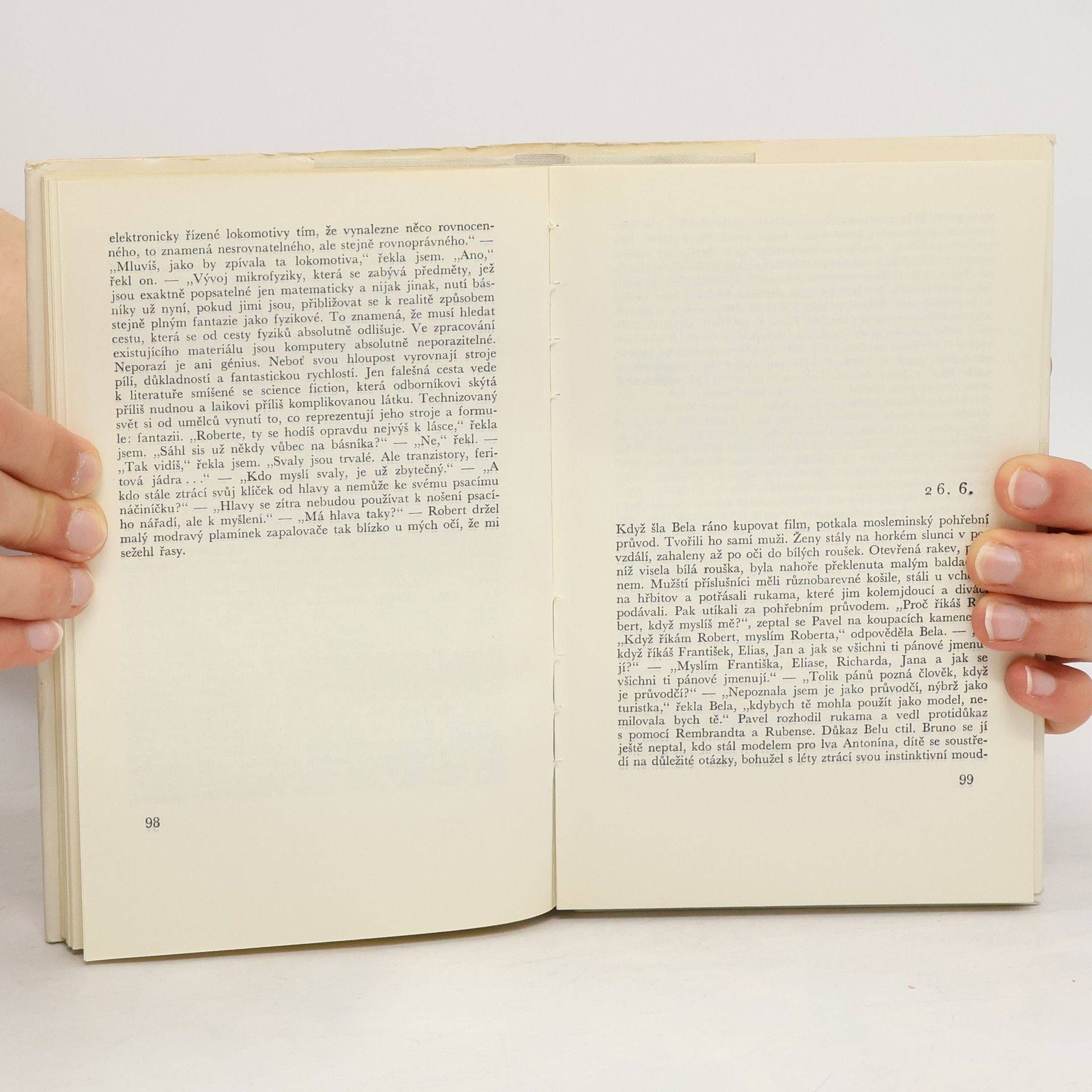 Dosti nezvyklou formou psaný román je moderní obdobou vyprávění Šeherezády. Autorka vypráví o dvou mladých lidech, kteří se spolu vydají na svatební cestu do Jugoslávie. Mladý muž, který je atomový fyzik, se i na této cestě věnuje především svým odborným problémům: dívka se snažírozptýlit jej a vypráví mu každý večer krátkou zábavnou historku. Některé z těchto příběhů připomínají osobní hrdinčiny vzpomínky a zážitky, jiné jsou absurdními fantastickými příběhy často až na hranici černého humoru.