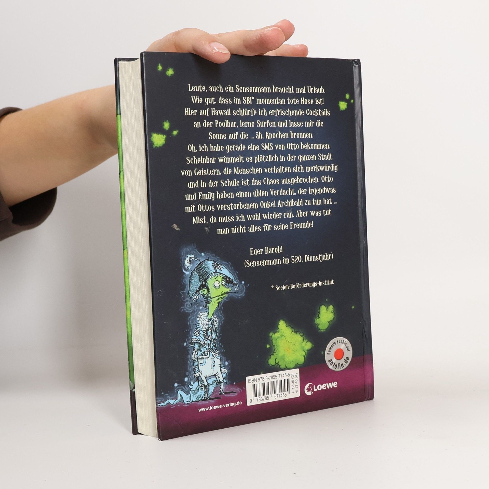 Leute, auch ein Sensenmann braucht mal Urlaub. Wie gut, dass im SBI* momentan tote Hose ist! Hier auf Hawaii schlürfe ich erfrischende Cocktails an der Poolbar, lerne Surfen und lasse mir die Sonne auf die … äh, Knochen brennen. Oh, ich habe gerade eine SMS von Otto bekommen. Scheinbar wimmelt es plötzlich in der ganzen Stadt von Geistern, die Menschen verhalten sich merkwürdig und in der Schule ist das Chaos ausgebrochen. Otto und Emily haben einen üblen Verdacht, der irgendwas mit Ottos verstorbenem Onkel Archibald zu tun hat … Mist, da muss ich wohl wieder ran. Aber was tut man nicht alles für seine Freunde! Euer Harold (Sensenmann im 520. Dienstjahr) *Seelen-Beförderungs-Institut