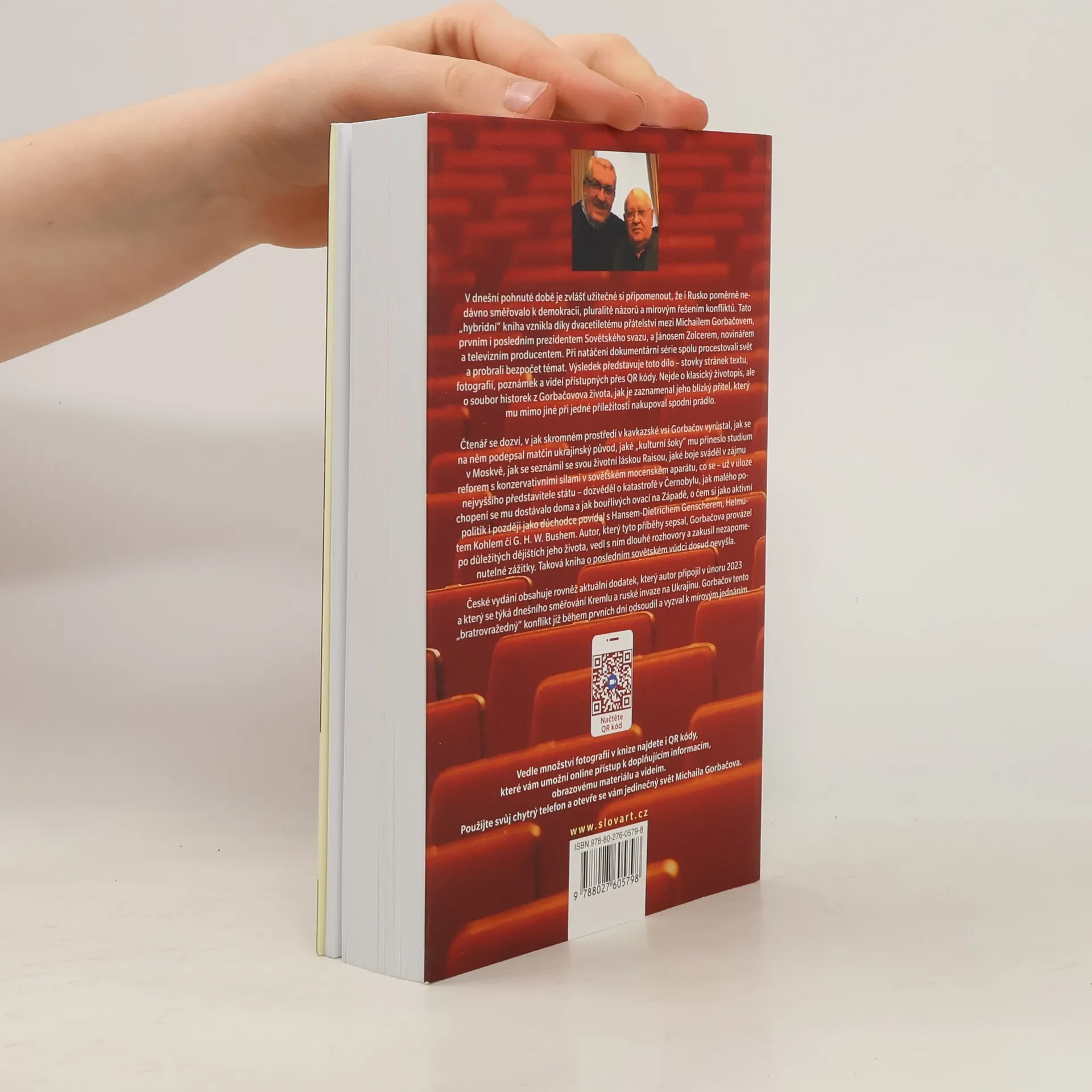 V dnešní pohnuté době je užitečné si připomenout, že Rusko nedávno směřovalo k demokracii a mírovým řešením konfliktů. Tato „hybridní“ kniha vznikla díky dvacetiletému přátelství mezi Michailem Gorbačovem, prvním i posledním prezidentem Sovětského svazu, a Jánosem Zolcerem, novinářem a televizním producentem. Při natáčení dokumentární série spolu procestovali svět a diskutovali o mnoha tématech. Výsledkem je soubor historek z Gorbačovova života, jak je zaznamenal jeho blízký přítel. Čtenář se dozví o skromném prostředí, v němž Gorbačov vyrůstal, o vlivu matčina ukrajinského původu, kulturních šocích ze studia v Moskvě, seznámení s jeho životní láskou Raisou, a o jeho bojích za reformy proti konzervativním silám v sovětském aparátu. Také se dozví, co se naučil o katastrofě v Černobylu, jaký měl ohlas doma a na Západě, a o rozhovorech s významnými politiky jako Hans-Dietrich Genscher či Helmut Kohl. Autor, který Gorbačova provázel důležitými místy jeho života a vedl s ním dlouhé rozhovory, přináší unikátní pohled na posledního sovětského vůdce. Taková kniha dosud nevyšla.