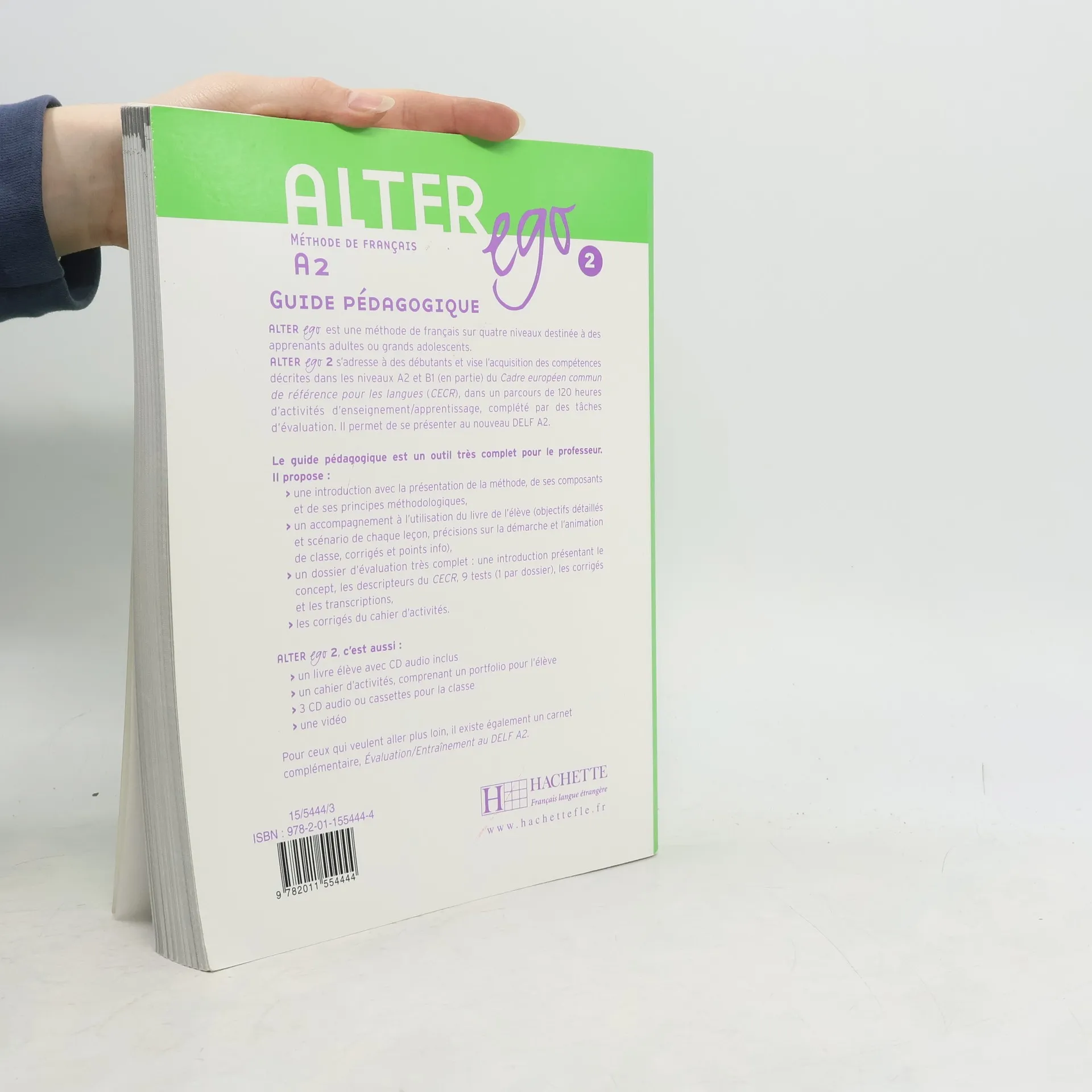 Le guide pédagogique est un outil très complet pour le professeur. Il propose: une introduction avec le présentation de la méthode, de ses composants et de ses principes méthodologiques; un accompagnement à l'utilisation du livre de l'élève (objectifs détaillés de classe, corrigés et points info); un dossier d'évaluation très complet: une introduction présentant le concept, les descripteurs du CECR, 9 tests (1 par dossier), les corrigés et les transcriptions; les corrigés du cahier d'activités -- Reverso de cubierta