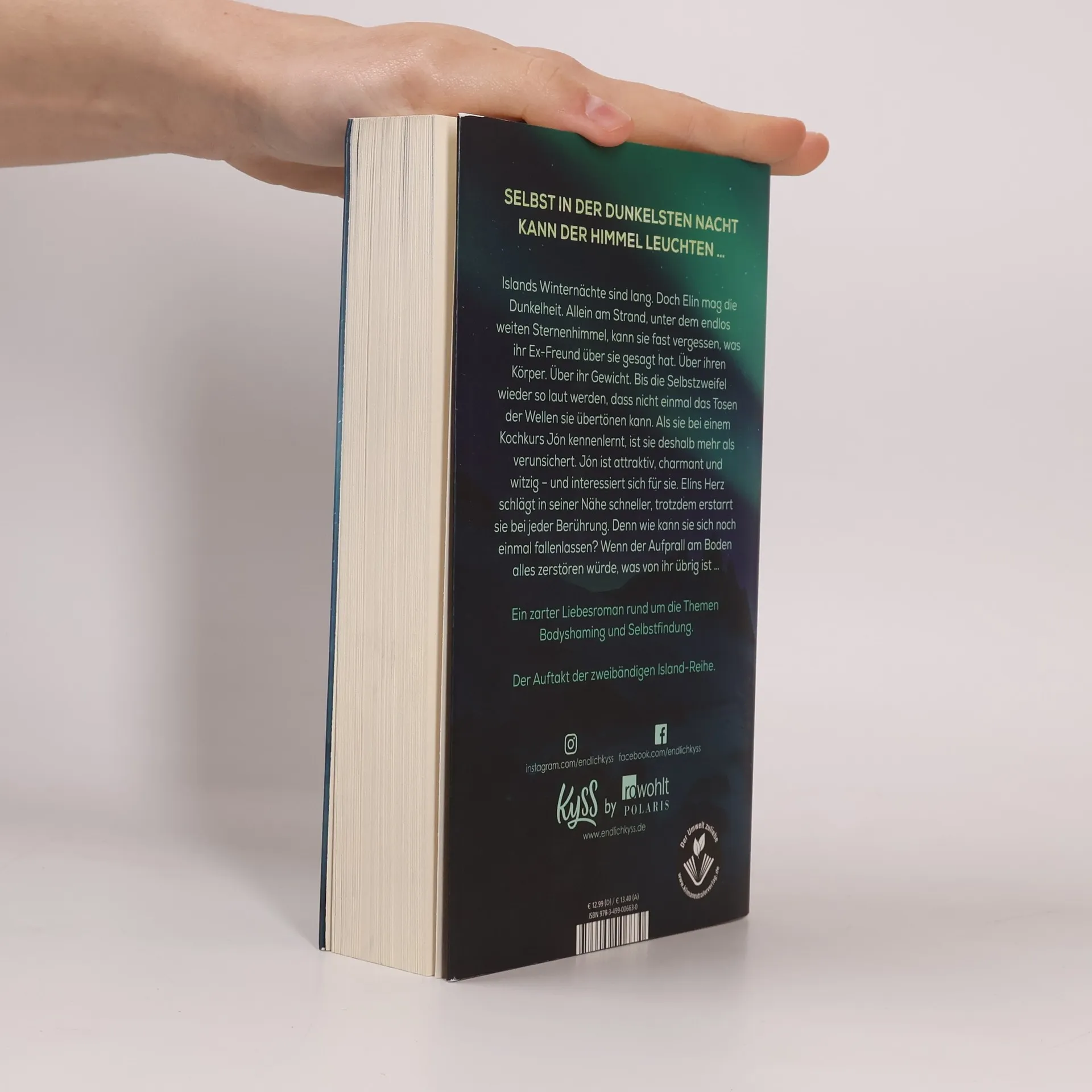 Sehnsuchtsort Island. Die neue zweibändige Reihe der Spiegel-Bestsellerautorin. Islands Winternächte sind lang. Doch Elín mag die Dunkelheit. Allein am Strand, unter dem endlos weiten Sternenhimmel, kann sie fast vergessen, was ihr Ex-Freund über sie gesagt hat. Über ihren Körper. Über ihr Gewicht. Bis die Selbstzweifel wieder so laut werden, dass nicht einmal das Tosen der Wellen sie übertönen kann. Als sie bei einem Kochkurs Jón kennenlernt, ist sie deshalb mehr als verunsichert. Jón ist attraktiv, charmant und witzig – und interessiert sich für sie. Elíns Herz schlägt in seiner Nähe schneller, trotzdem erstarrt sie bei jeder Berührung. Denn wie kann sie sich noch einmal fallen lassen? Wenn der Aufprall am Boden alles zerstören würde, was von ihr übrig ist … Ein zarter Liebesroman rund um die Themen Bodyshaming und Selbstfindung. Dunkle Nächte und tanzende Nordlichter. Band 1 der Island-Reihe, das Winterbuch.
