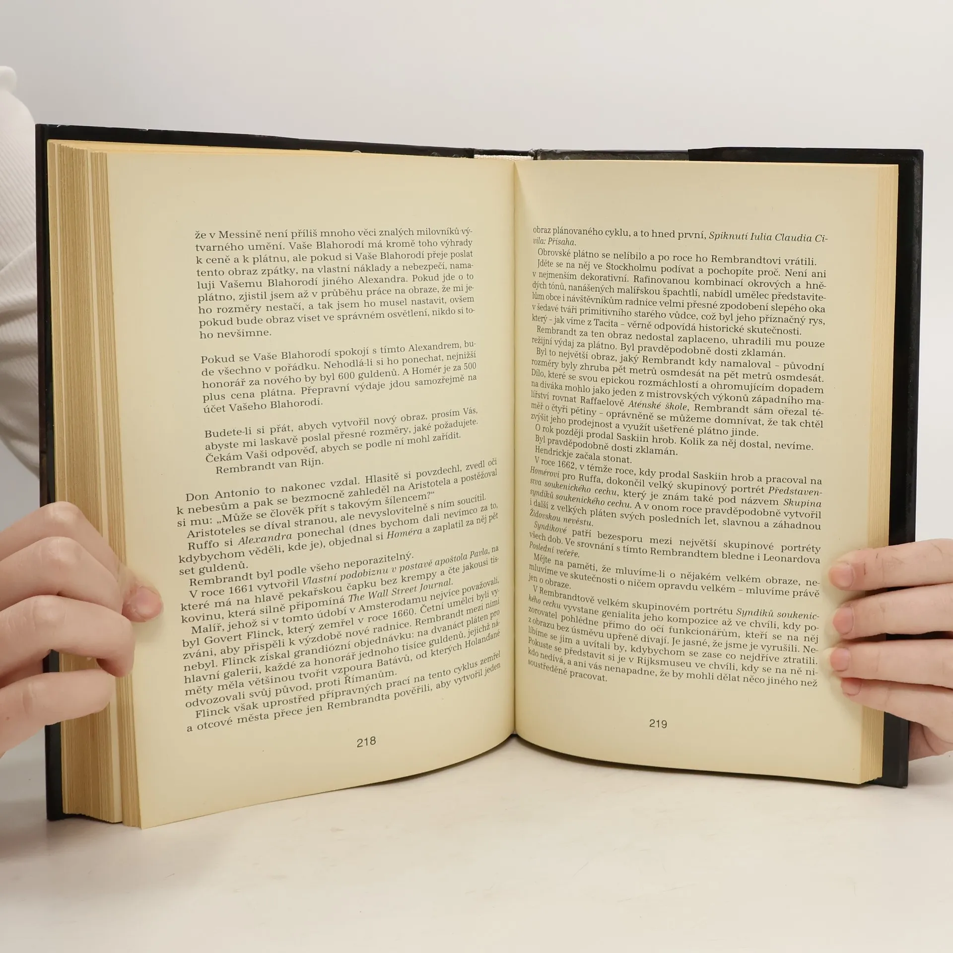 Ve sžíravě ironickém textu, se prolínají tři dějové a časové roviny: starořecké Athény s postavami filosofů Aristotela, Sokrata a Platóna, Holandsko sedmnáctého století a osudy malíře Rembrandta (propojeného s Aristotelem tím, že maloval jeho obraz) a Amerika konce dvacátého století. Osou celého příběhu je právě obraz „Aristoteles přemýšlí nad bustou Homérovou“, skrze nějž se všechny časové a dějové linky podivuhodně spojují a volně prolínají a skrze nějž se tak klene historický oblouk od filozofie ducha k filozofii peněz. Mistrovská ukázka postmoderního románu: Tam, kde autor přistupuje k zevrubnému výkladu vlastního pojetí dějin, klade události do nečekaných souvislostí.