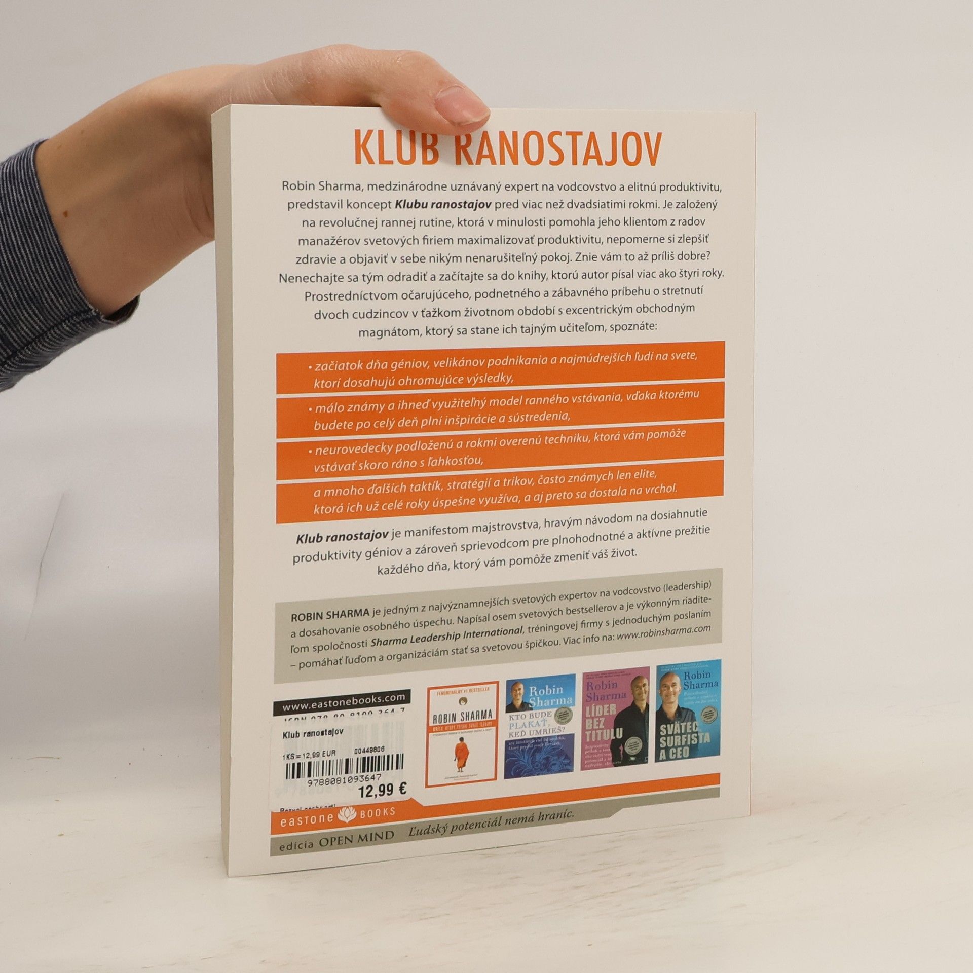 Robin Sharma, medzinárodne uznávaný expert na vodcovstvo a elitnú produktivitu, predstavil koncept Klubu ranostajov pred viac než 20 rokmi. Je založený na revolučnej rannej rutine, ktorá v minulosti pomohla jeho klientom z radov manažérov svetových firiem maximalizovať produktivitu, nepomerne si zlepšiť zdravie a objaviť v sebe nikým nenarušiteľný pokoj. Začítajte sa do knihy, ktorú autor písal viac ako štyri roky. Prostredníctvom podnetného a zábavného príbehu o stretnutí dvoch cudzincov v ťažkom životnom období s excentrickým obchodným magnátom, ktorý sa stane ich tajným učiteľom, spoznáte: začiatok dňa géniov a velikánov podnikania, málo známy a ihneď využiteľný model ranného vstávania, neurovedecky podloženú a rokmi overenú techniku a mnoho ďalších trikov často známych len elite, ktorá ich už celé roky úspešne využíva, a aj preto sa dostala na vrchol.
