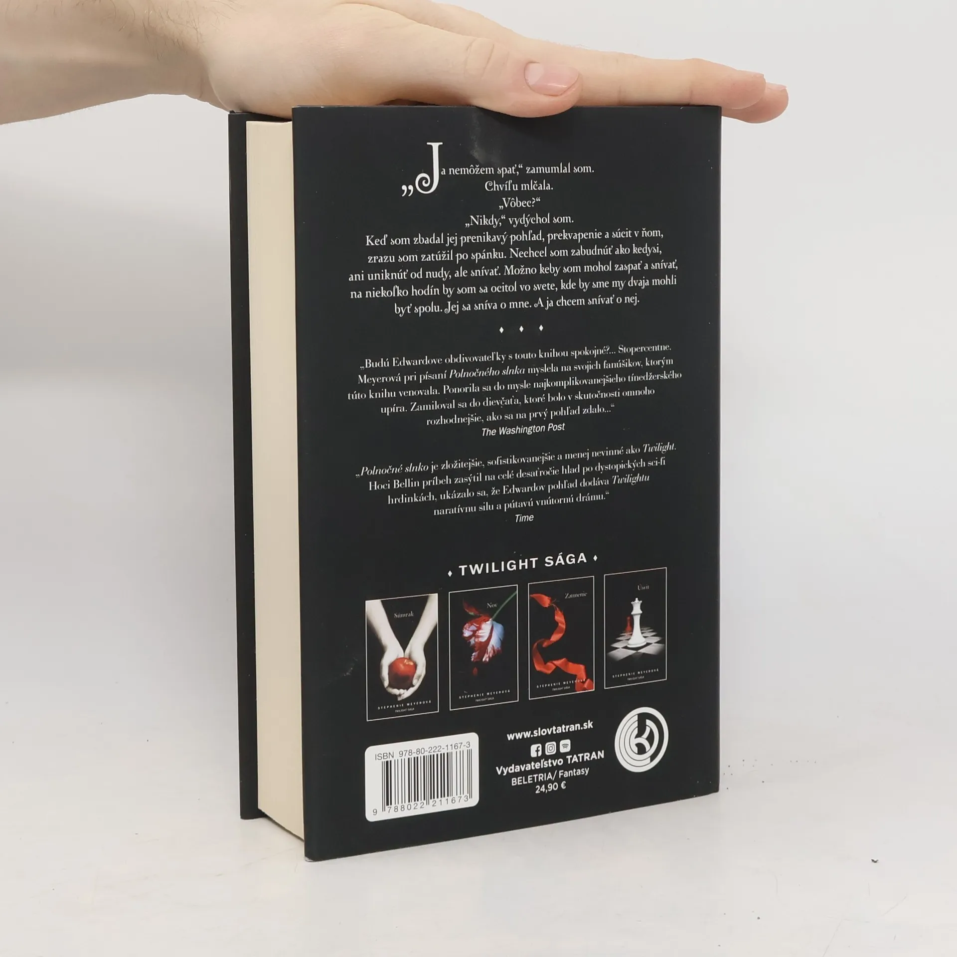 Kultová Twilight sága sa začiatkom milénia stala ópiom pre celú generáciu. Zvodný upír Edward pobláznil nielen vnučky, ale aj mamy a staré mamy. Konečne – takmer po pätnástich rokoch – prichádza prerozprávanie príbehu veľkej lásky z Edwardovho pohľadu. Dlho očakávaný návrat do sveta Twilightu je jednoznačne triumfom. Ikonický príbeh Belly a Edwarda nadobúda nový temný podtón. Pre Edwarda je to najzaujímavejšia udalosť, akú zažil počas svojho dlhého života. Bellin príchod ho znepokojí a fascinuje, s podobným pocitom sa za celé roky v podobe upíra ešte nestretol. V Polnočnom slnku sa dozvieme aj fascinujúce podrobnosti z Edwardovej minulosti, sledujeme jeho vnútorný boj pri pohľade na Bellu, a pochopíme, že je to rozhodujúci zápas jeho života. Edwardov pohľad je zrelší, autorka dotvorila jeho postavu do detailov a zároveň sa viac venuje členom upírskej rodiny, pohnutej histórii Rosalie a jej vzťahu s bratom, Aliciiným víziám a Jasperovmu talentu. Polnočné slnko naplnilo očakávania fanúšikov natoľko, že mnohí volajú po pokračovaní ságy z Edwardovho pohľadu. Twilight zaujal milióny čitateľov, stal sa literárnym fenoménom a stvárnil pre jednu generáciu ideál nesmrteľnej lásky.