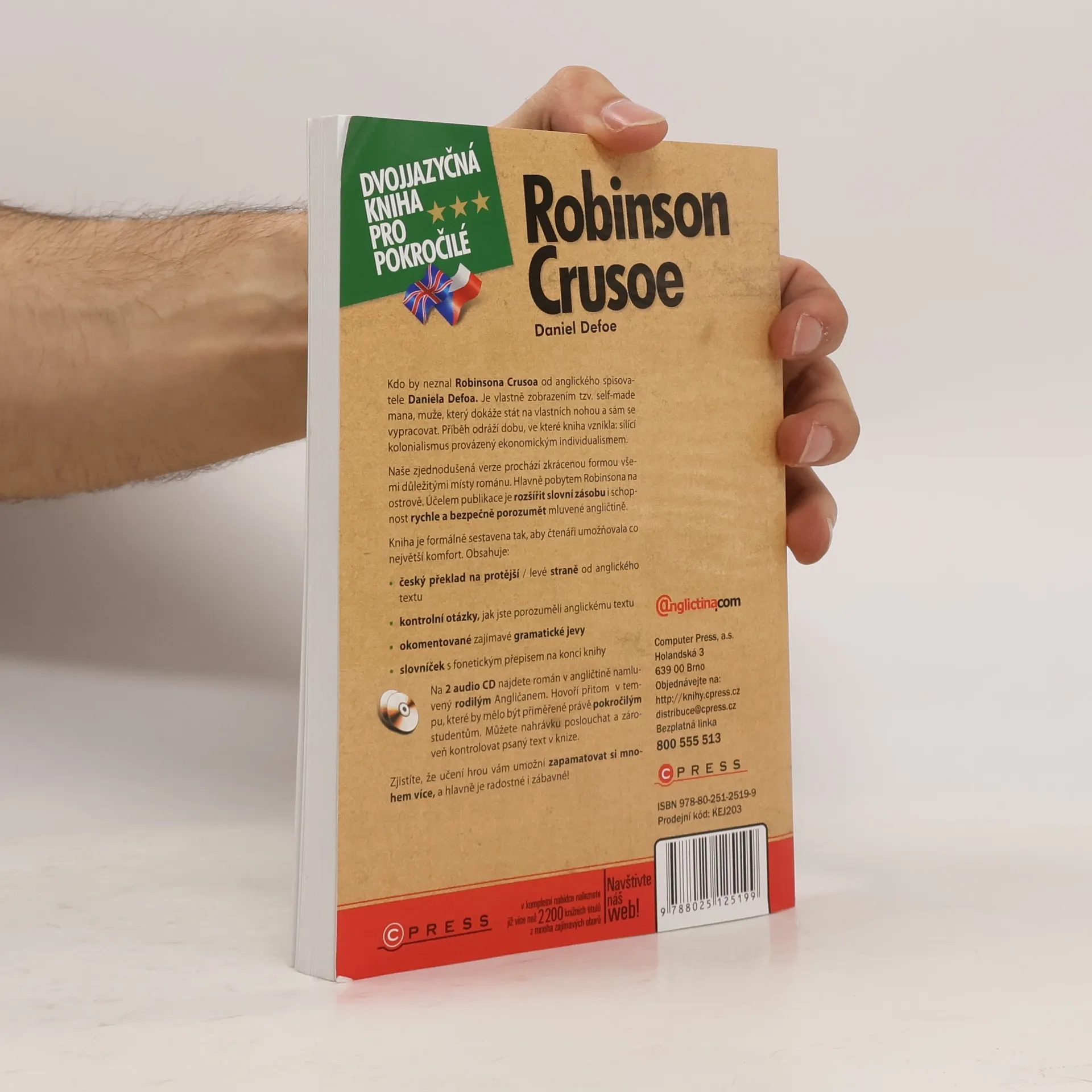 Dvojjazyčné vydání. Jazyková úroveň - Pokročilí. Příběh Robinsona Crusoe patří zaslouženě do zlatého fondu světové literatury. Ukazuje vůli člověka, který věří sám v sebe a dokáže tak překonat řadu životních nezdarů. Odráží tak vlastně tehdy nastupující ekonomický individualismus. Pro pokročilé studenty angličtiny jsme vytvořili jeho zjednodušenou verzi doplněnou českým překladem (po levé straně), slovníčkem, překladem frází a okomentováním gramatických jevů. Čtenář tak může číst originální povídku, pokud by něčemu nerozuměl ihned najde překlad či komentář. Uživatel tak může cvičit své porozumění mluvené angličtině.