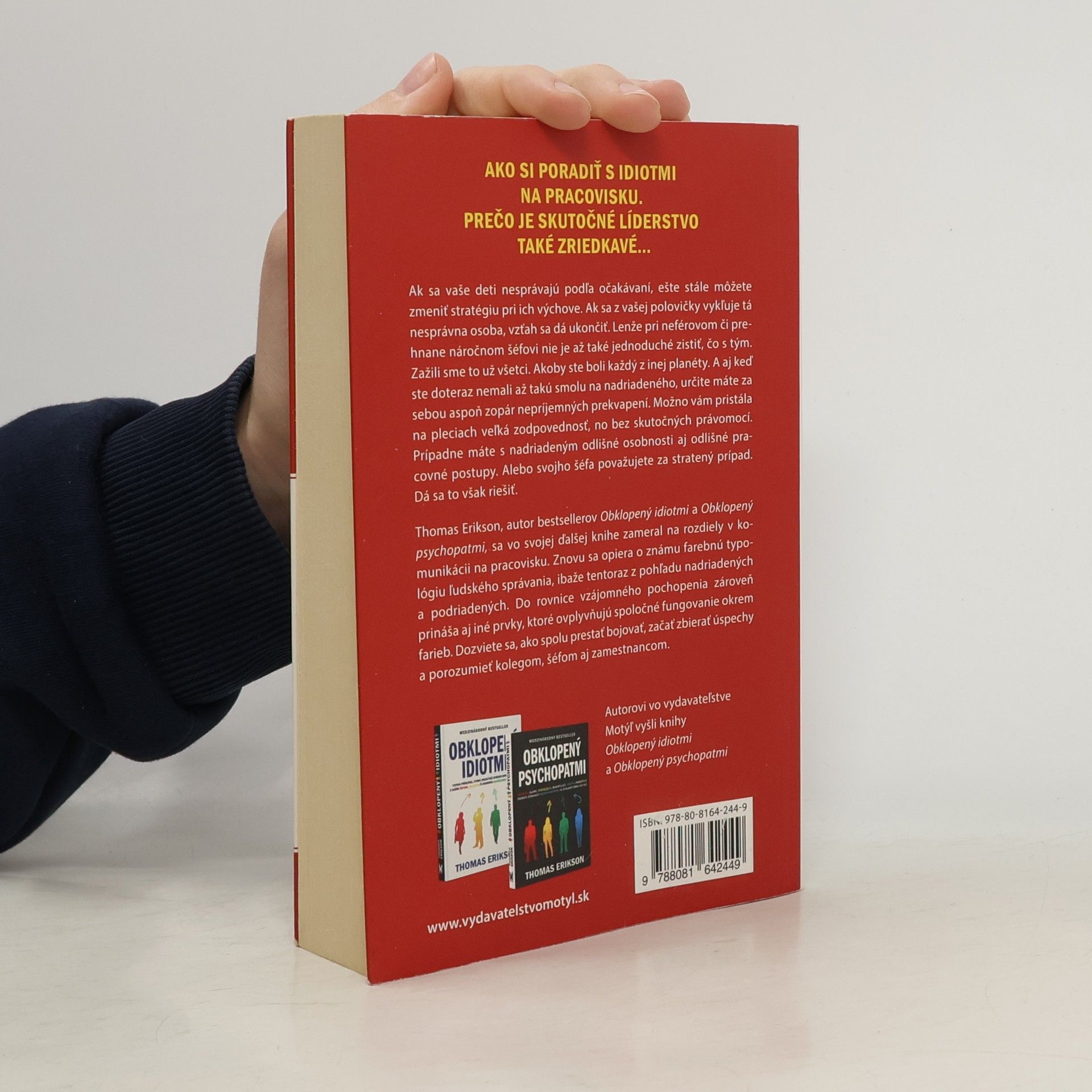 Ako si poradiť s idiotmi na pracovisku. Prečo je skutočné líderstvo také zriedkavé. Ak sa vaše deti nesprávajú podľa očakávaní, ešte stále môžete zmeniť stratégiu pri ich výchove. Ak sa z vašej polovičky vykľuje tá nesprávna osoba, vzťah sa dá ukončiť. Lenže pri neférovom či prehnane náročnom šéfovi nie je až také jednoduché zistiť, čo s tým. Zažili sme to už všetci. Akoby ste boli každý z inej planéty. A aj keď ste doteraz nemali až takú smolu na nadriadeného, určite máte za sebou aspoň zopár nepríjemných prekvapení. Možno vám pristála na pleciach veľká zodpovednosť, no bez skutočných právomocí. Prípadne máte s nadriadeným odlišné osobnosti aj odlišné pracovné postupy. Alebo svojho šéfa považujete za stratený prípad. Dá sa to však riešiť. Thomas Erikson, autor bestsellerov Obklopený idiotmi a Obklopený psychopatmi, sa vo svojej ďalšej knihe zameral na rozdiely v komunikácii na pracovisku. Znovu sa opiera o známu farebnú typológiu ľudského správania, ibaže tentoraz z pohľadu nadriadených a podriadených. Do rovnice vzájomného pochopenia zároveň prináša aj iné prvky, ktoré ovplyvňujú spoločné fungovanie okrem farieb. Dozviete sa, ako spolu prestať bojovať, začať zbierať úspechy a porozumieť kolegom, šéfom aj zamestnancom.