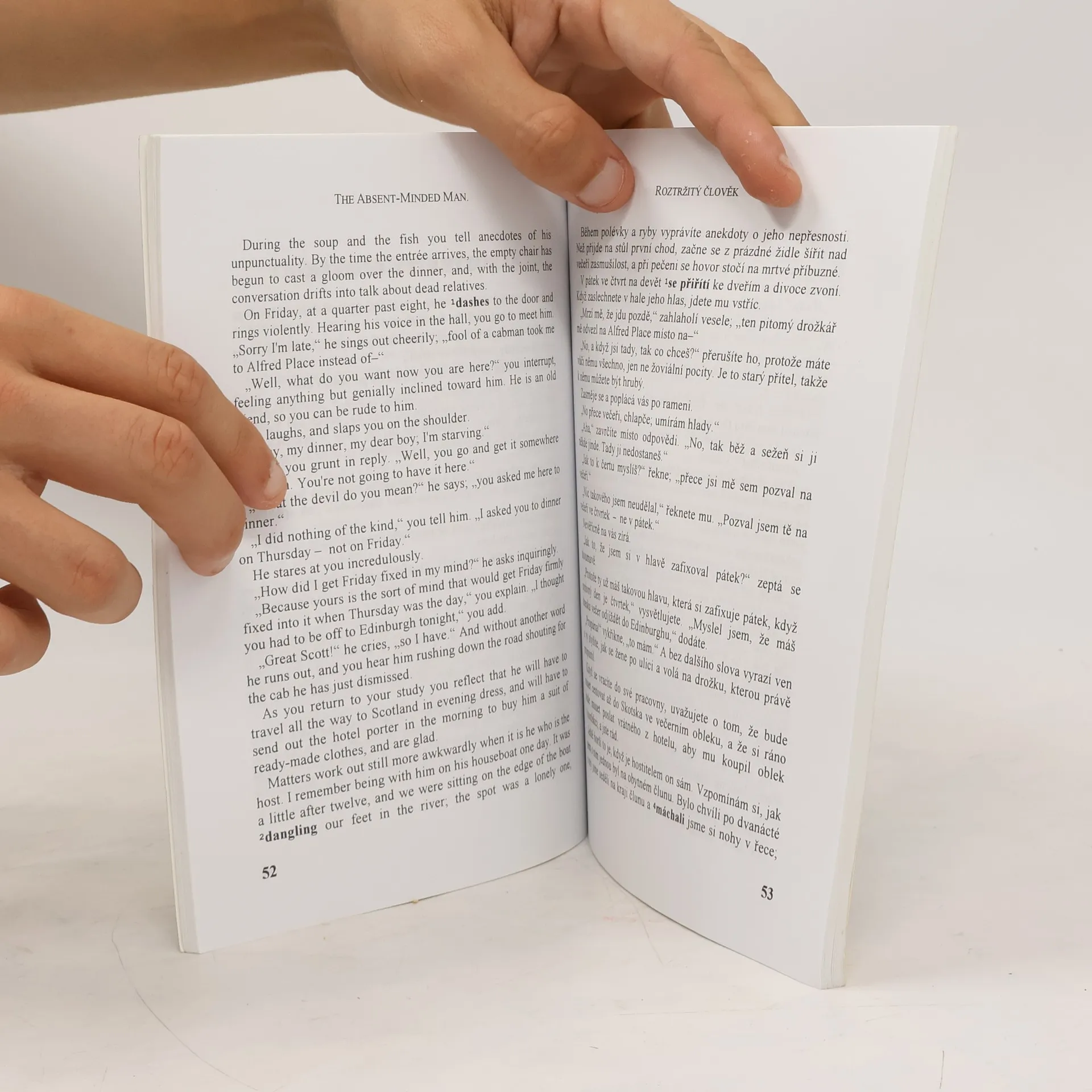 Sedm povídek Jeroma K. Jeromeho v zrcadlovém vydání – na sudých stranách text v anglickém jazyce, na lichých český překlad. Pořadí povídek: - The Man Who Did Not Believe in Luck / Muž, který nevěřil ve štěstí - Should Women Be Beautiful? / Mají být ženy krásné? - On the Preparation and Employment of Love Philters / O přípravě a používání nápojů lásky - The Absent-Minded Man / Roztržitý člověk - Should We Say What We Think, Or Think What We Say? / Máme říkat, co si myslíme, nebo si myslet, co říkáme? - On the Inadvisability of Following Advice / O tom, že není radno uposlechnout rady