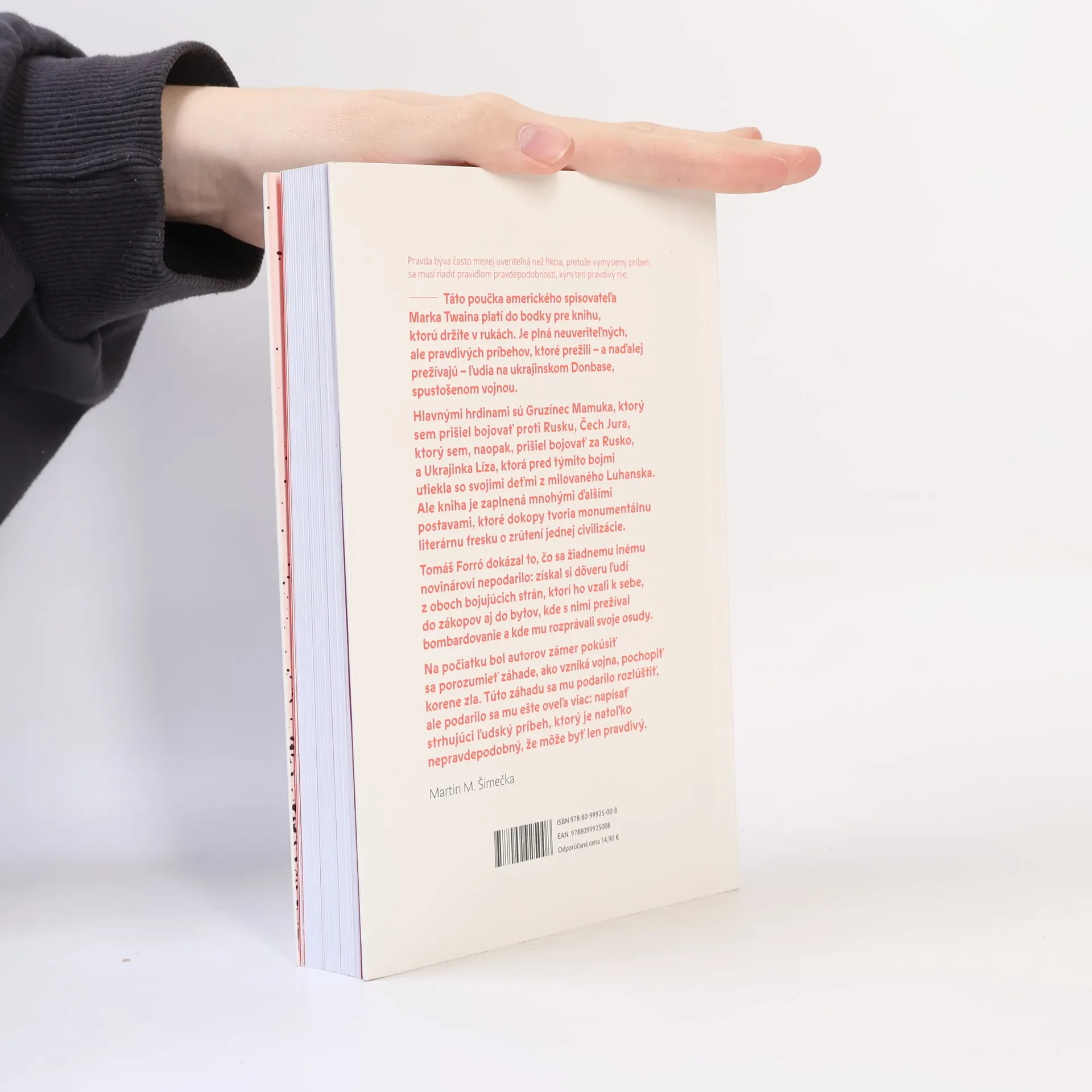 Autorská reportážna kniha o svete na oboch stranách frontovej línie Donbasu. Pravda býva často menej uveriteľná než fikcia, pretože vymyslený príbeh sa musí riadiť pravidlom pravdepodobnosti, kým ten pravdivý nie. - Táto poučka amerického spisovateľa Marka Twaina platí do bodky pre knihu pôvodných reportáží, ktorej autorom je Tomáš Forró. Je plná neuveriteľných, ale pravdivých príbehov, ktoré prežili - a naďalej prežívajú - ľudia v ukrajinskom Donbase, spustošenom vojnou. Tomáš Forró dokázal to, čo sa žiadnemu inému novinárovi nepodarilo: získal si dôveru ľudí z oboch bojujúcich strán, ktorí ho vzali k sebe, do zákopov aj do bytov, kde s nimi prežíval bombardovanie a kde mu rozprávali svoje osudy.