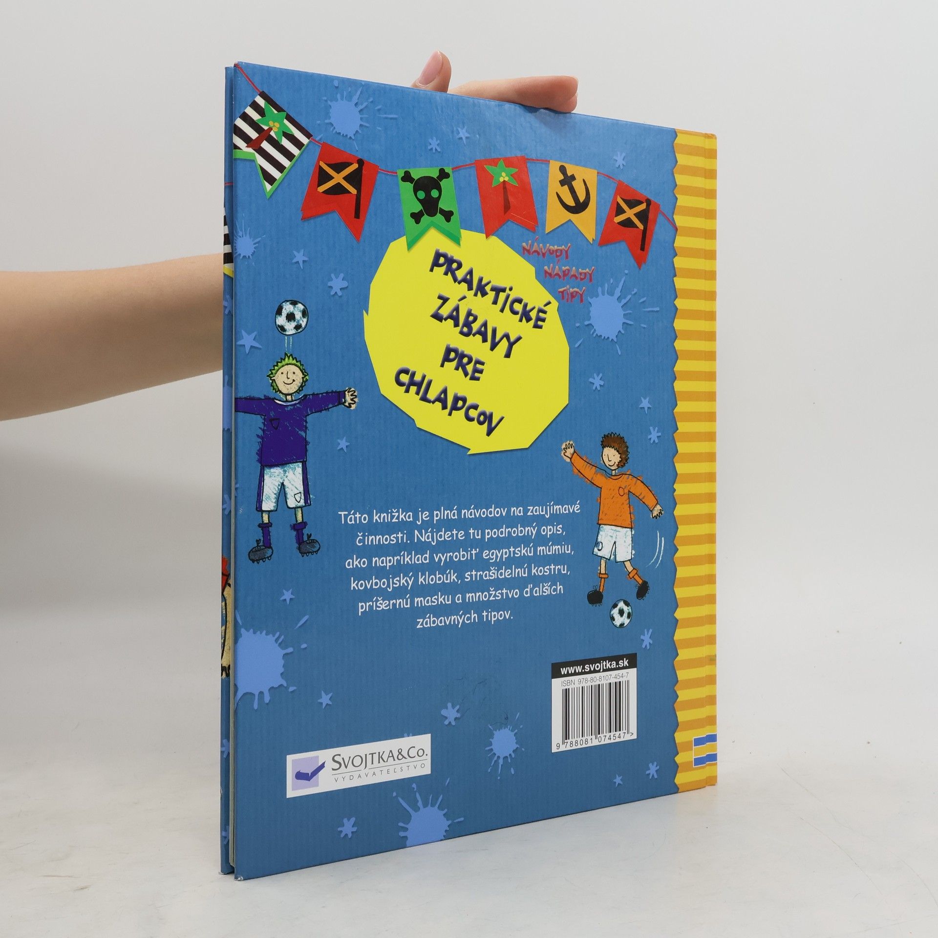 Táto knižka je plná návodov na zaujímavé činnosti. Nájdete tu podrobný opis, ako napríklad vyrobiť egyptskú múmiu, kovbojský klobúk, strašidelnú kostru, príšernú masku a množstvo ďalších zábavných tipov. Vyberte si spomedzi 50 rôznych motívov a doprajte aj chlapcom objaviť v sebe kreativitu a zmysel pre tvorivú prácu.