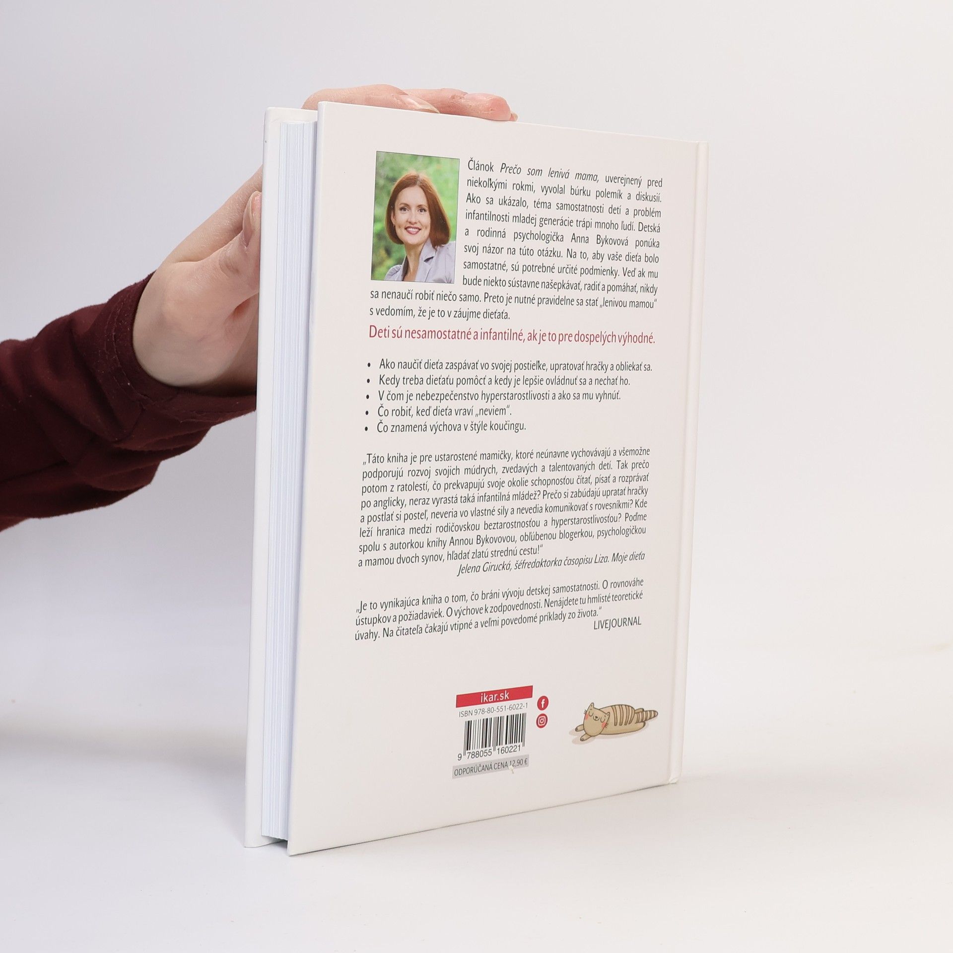 „Táto kniha je pre ustarostené mamičky, ktoré neúnavne vychovávajú a všemožne podporujú rozvoj svojich múdrych, zvedavých a talentovaných detí. Tak prečo potom z ratolestí, čo prekvapujú svoje okolie schopnosťou čítať, písať a rozprávať po anglicky, neraz vyrastá taká infantilná mládež? Prečo si zabúdajú upratať hračky a postlať si posteľ, neveria vo vlastné sily a nevedia komunikovať s rovesníkmi? Kde leží hranica medzi rodičovskou bezstarostnosťou a hyperstarostlivosťou? Poďme spolu s autorkou knihy Annou Bykovovou, obľúbenou blogerkou, psychologičkou a mamou dvoch synov, hľadať zlatú strednú cestu!“ Jelena Girucká, šéfredaktorka časopisu Liza. Moje dieťa