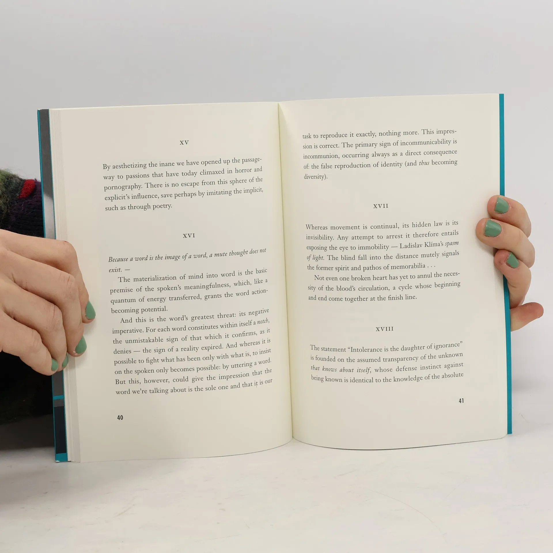 Tato kniha byla vydána českým nakladatelstvím Twisted Spoon Press, které sídlí v Praze a vydává díla českých a slovanských autorů v anglickém jazyce. Oficiální anotace nakladatele: Called “the Czech Cioran” by Andrei Codrescu, Róbert Gál is one of the freshest voices to come from Prague over the past few years. His writing is a mix of philosophy and prose poetry that explores the tenuousness of one's identity and existence. Ironical in his outlook, Gál's aim with this volume is to bring the great Romanian philosopher E. M. Cioran into the present in the same way that John Zorn, whose music provided the impetus for writing this book, brought Ornette Coleman into the present. The volume includes aphorisms and longer and shorter “philosophical” fragments. The photographs by Lucia Nimcová were taken specifically for this collection. As aptly described by well-known psychiatrist/publisher Ales Pech, Nimcová's nude self-portraits act as a “counterpoint to the philosophical denuding that is the book's basic premise.”
