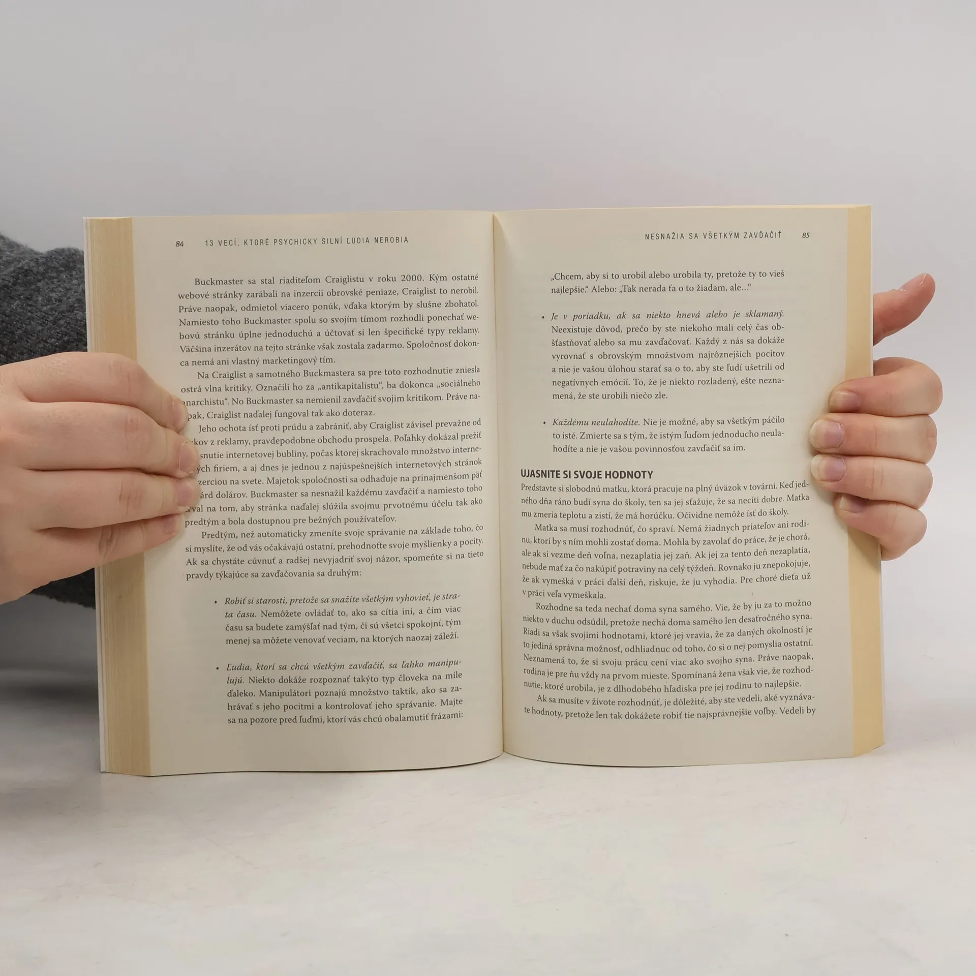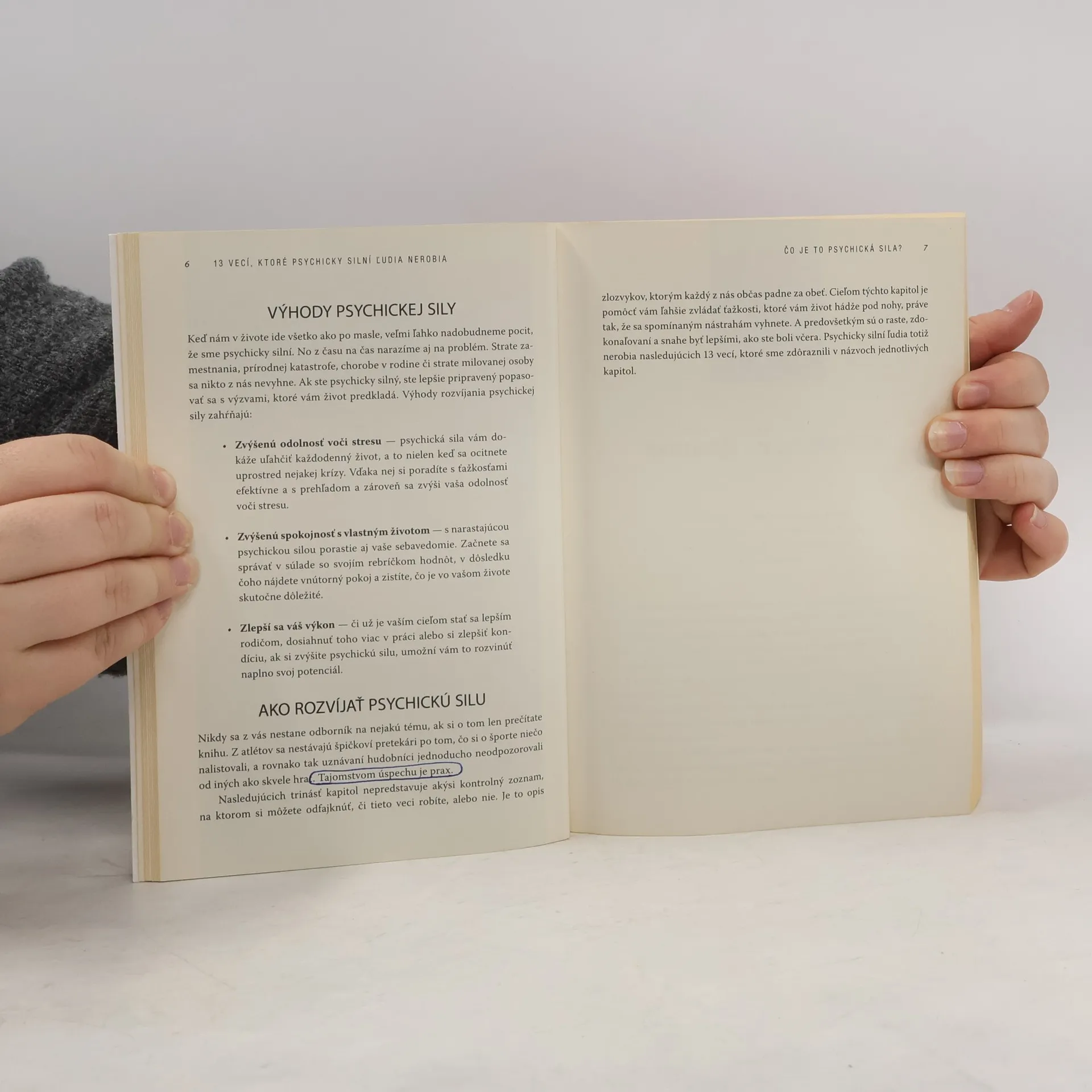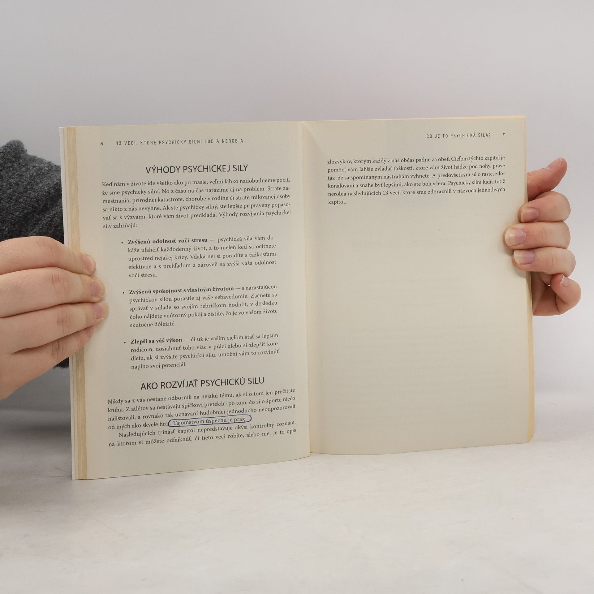 Ako je možné, že niektorí ľudia dokážu byť šťastní a dosahovať úspechy, aj napriek nespočetným životným skúškam, ktorým neustále čelia? Z čoho pramení ich vnútorná vyrovnanosť a sila zvládnuť každú životnú situáciu? Nad týmito otázkami sa zamyslela aj psychoterapeutka Amy Morin, ktorá vo svojej knihe nepíše o tom, čo všetko pre dosiahnutie vyrovnaného života treba robiť, ale o tom, čo stačí nerobiť. Svoje myšlienky predstavuje v širšom koncepte osobnej psychickej sily, ktorá ovplyvňuje naše myslenie a následne aj správanie voči sebe či iným ľuďom. V každej kapitole tejto knihy sa venuje jednej veci, ktorú ľudia vplyvom okolností zvyknú robiť a neuvedomujú si, že sami (a často nechtiac) tak zo seba robia zúfalcov či slabochov. Následne dáva čitateľom inštrukcie, ako tento prejav zo života prirodzene vylúčiť a nahradiť ho prejavom psychicky silnej, vnútorne vyrovnanej osobnosti, schopnej čeliť akejkoľvek situácii.