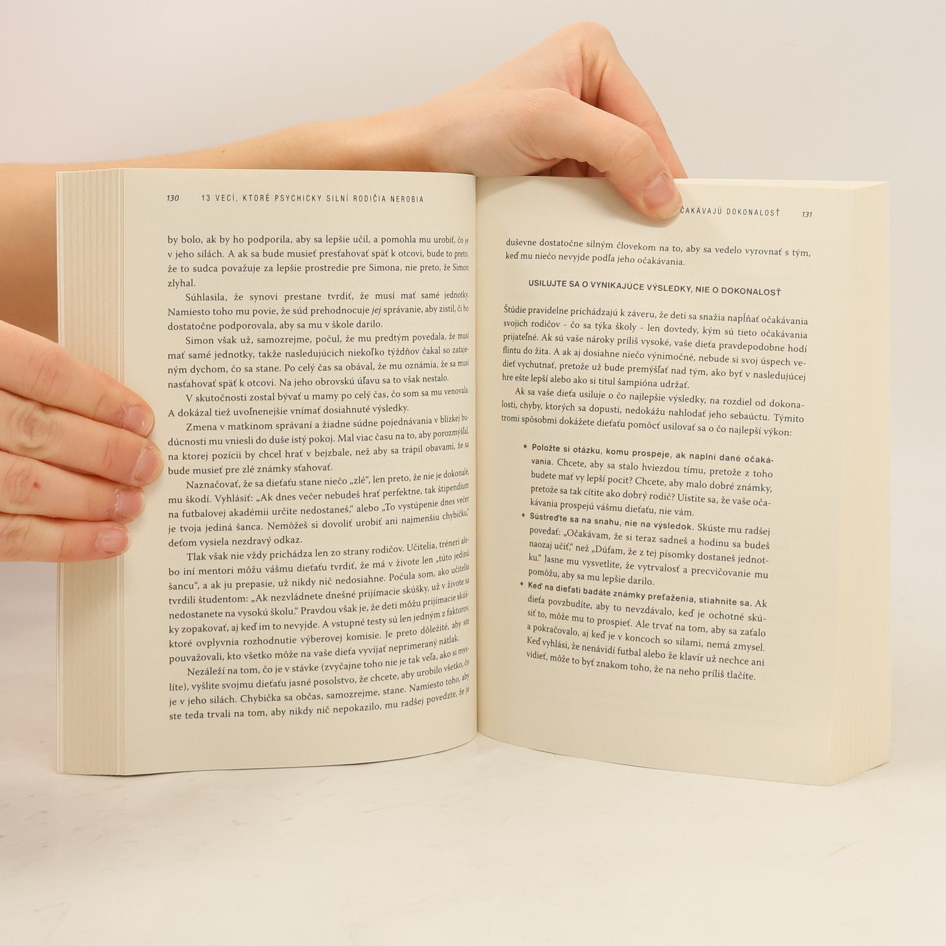 Autorka medzinárodného bestsellera 13 vecí, ktoré psychicky silní ľudia nerobia si tentoraz posvietila na rodičov, ktorých učí, ako vychovať psychicky silné a odolné deti, lebo, ako tvrdí, je jednoduchšie vychovať psychicky silné deti, než pomôcť zlomeným dospelým ľuďom, lebo získať psychickú silu v detstve, ktoré predstavuje obrovskú škálu možností na rast, je omnoho ľahšie. Rodičia síce nedokážu svoje dieťa ochrániť pred nepriazňou osudu, ale ak ho vyzbroja nástrojmi, ktoré potrebuje pre psychickú odolnosť, dokáže tieto prekážky premeniť na príležitosť, ako sa stať silnejším a lepším. V knihe sa dozviete, ako dovoliť dieťaťu robiť chyby, ale nerobiť z neho stredobod vesmíru, ako sa pri výchove nenechať ovládať pocitom viny, ale zároveň nebyť príliš prísny, ako si nemýliť disciplínu s trestaním a nebudovať v dieťati mentalitu obete, ale aj to, ako nedovoliť, aby strach o dieťa primárne určoval to, ako ho vychovávate… a mnoho ďalších užitočných rád a postojov.