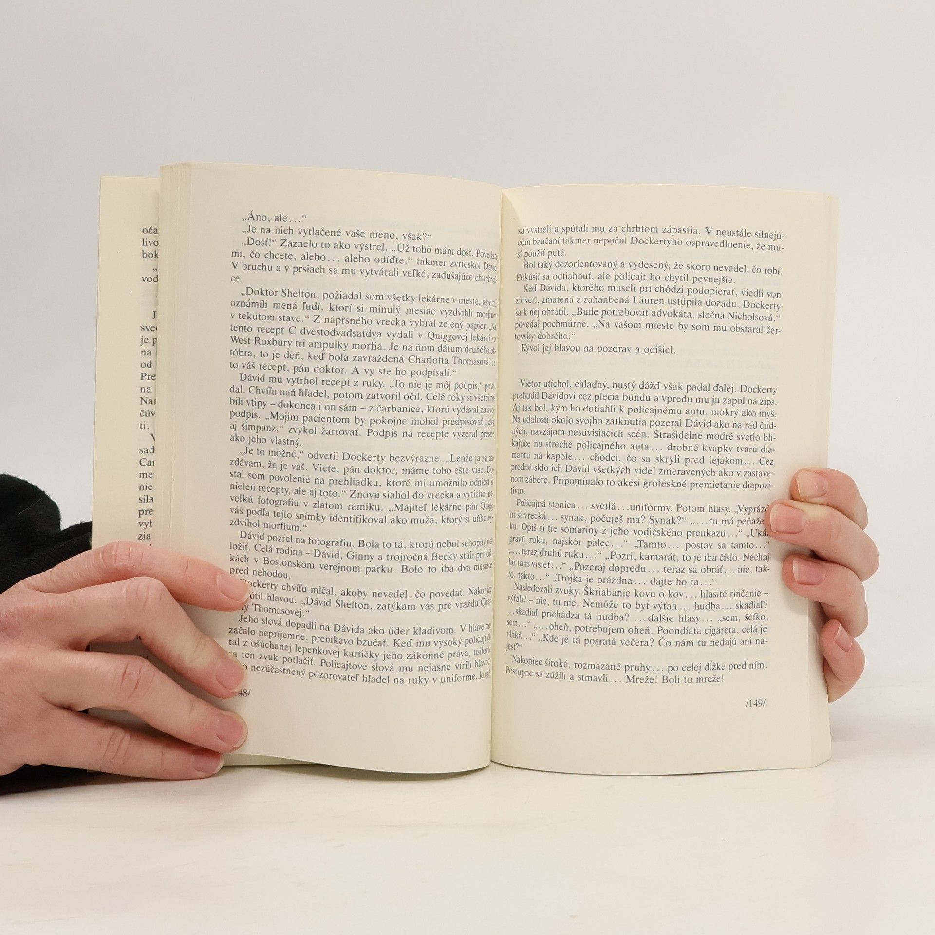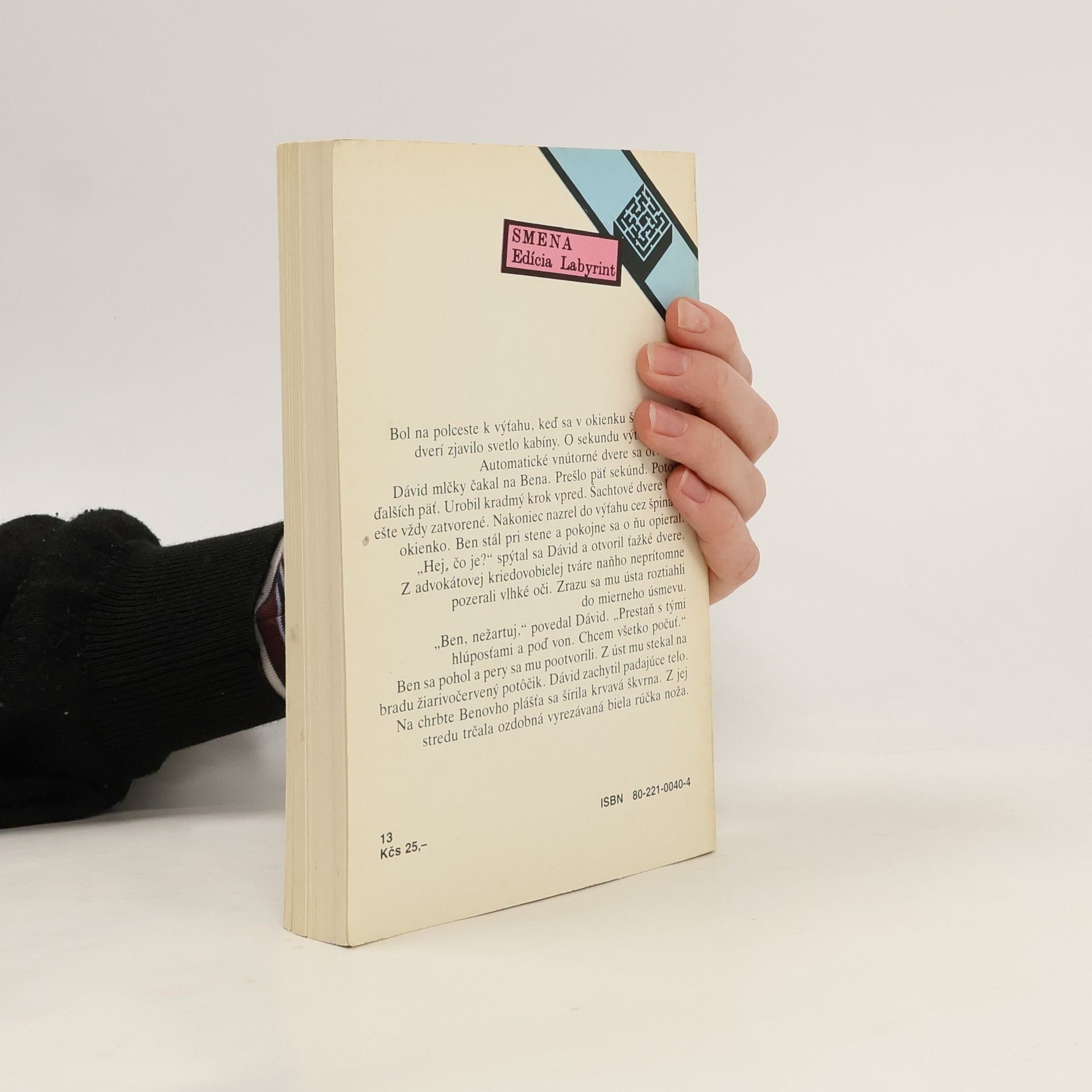 Bol na polceste k výťahu, keď sa v okienku šachtových dverí zjavilo svetlo kabíny. O sekundu výťah zastal. Automatické vnútorné dvere sa otvorili. Dávid mlčky čakal na Bena. Prešlo päť sekúnd. Potom ďalších päť. Urobil kradmý krok vpred. Šachtové dvere boli ešte vždy zatvorené. Nakoniec nazrel do výťahu cez špinavé okienko. Ben stál pri stene a pokojne sa o ňu opieral. „Hej, čo je?" spýtal sa Dávid a otvoril ťažké dvere. Z advokátovej kriedovobielej tváre naňho neprítomne pozerali vlhké oči. Zrazu sa mu ústa roztiahli do mierneho úsmevu. „Ben, nežartuj," povedal Dávid. „Prestaň s tými hlúposťami a poď von. Chcem všetko počuť." Ben sa pohol a pery sa mu pootvorili. Z úst mu stekal na bradu žiarivočervený potôčik. Dávid zachytil padajúce telo. Na chrbte Benovho plášťa sa šírila krvavá škvrna. Z jej stredu trčala ozdobná vyrezávaná biela rúčka noža.