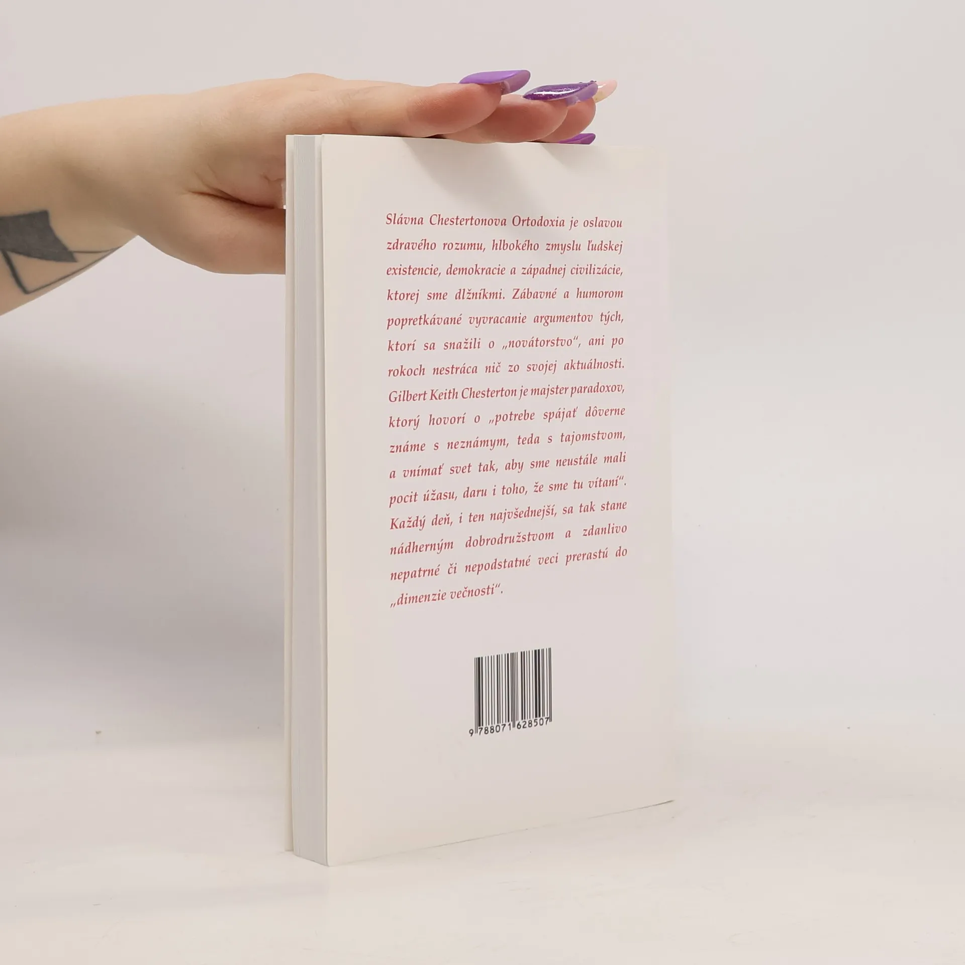 Slávna Chestertonova Ortodoxia je oslavou zdravého rozumu, hlbokého zmyslu ľudskej existencie, demokracie a západnej civilizácie, ktorej sme dlžníkmi. Zábavné a humorom popretkávané vyvracanie argumentov tých, ktorí sa snažili o „novátorstvo“, ani po rokoch nestráca nič zo svojej aktuálnosti. Gilbert Keith Chesterton je majster paradoxov, ktorý hovorí o „potrebe spájať dôverne známe s neznámym, teda s tajomstvom, a vnímať svet tak, aby sme neustále mali pocit úžasu, daru i toho, že sme tu vítaní“. Každý deň, i ten najvšednejší, sa tak stane nádherným dobrodružstvom a zdanlivo nepatrné či nepodstatné veci prerastú do „dimenzie večnosti“. Vydanie prvé