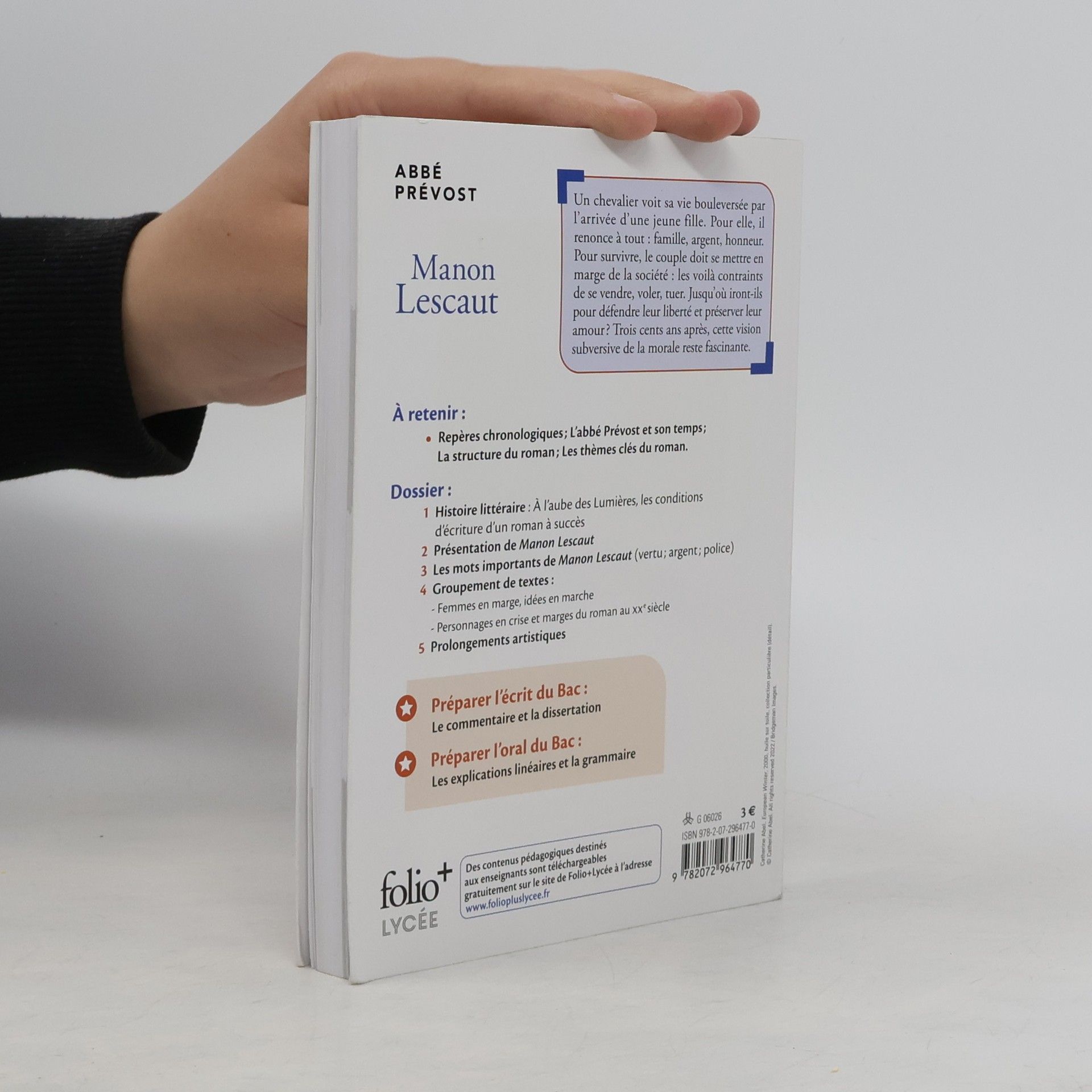 Un chevalier voit sa vie bouleversée par l'arrivée d'une jeune fille. Pour elle, il renonce à tout : famille, argent, honneur. Pour survivre, le couple doit se mettre en marge de la société : les voilà contraints de se vendre, voler, tuer. Jusqu'où iront-ils pour défendre leur liberté et préserver leur amour ? Trois cents ans après, cette vision subversive de la morale reste fascinante. À retenir : - Repères chronologiques ; L'abbé Prévost et son temps ; La structure du roman ; Les thèmes clés du roman. Dossier : 1- Histoire littéraire : À l'aube des Lumières, les conditions d'écriture d'un roman à succès 2- Présentation de Manon Lescaut 3- Les mots importants de Manon Lescaut (vertu ; argent ; police) 4- Groupement de textes : - Femmes en marge, idées en marche - Personnages en crise et marges du roman au XXᵉ siècle 5- Prolongements artistiques Préparer l'écrit du Bac : Le commentaire et la dissertation Préparer l'oral du Bac : Les explications linéaires et la grammaire.