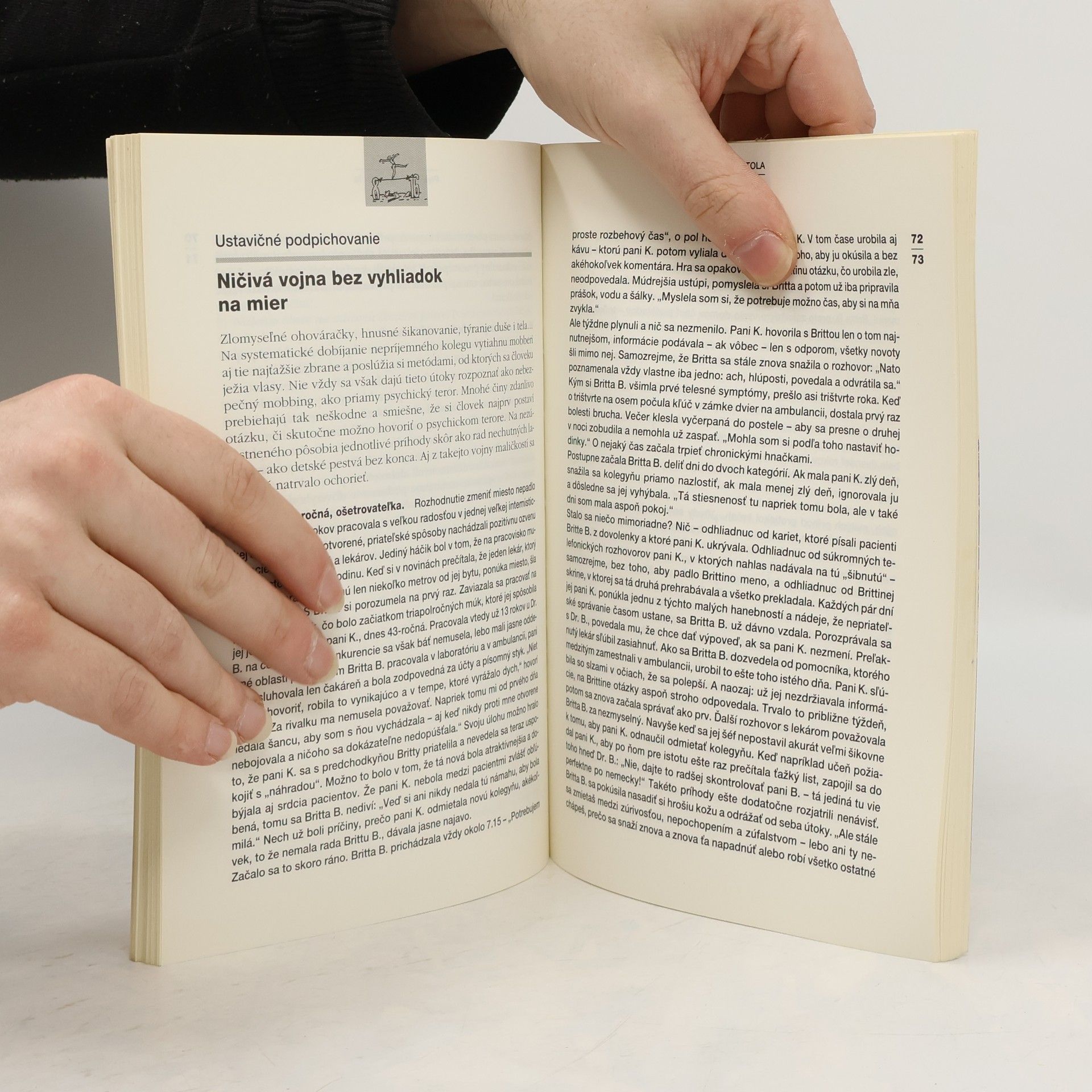 Kniha opisuje príčiny, páchateľov a následky mobbingu, obsahuje testy, ktoré analyzujú kritický potenciál na pracovisku, odhaľuje najčastejšie mobbingové metódy a vysvetľuje, čo sa dá konkrétne robiť na zastavenie dynamiky mobbingového procesu alebo ešte lepšie, ako ho od samého začiatku zbaviť živnej pôdy. Je to poradca pre postihnutých i nezúčastnených, ktorí sa už nemienia ďalej prizerať, ale chcú niečo proti psychickému teroru na pracovisku podniknúť.... celý text