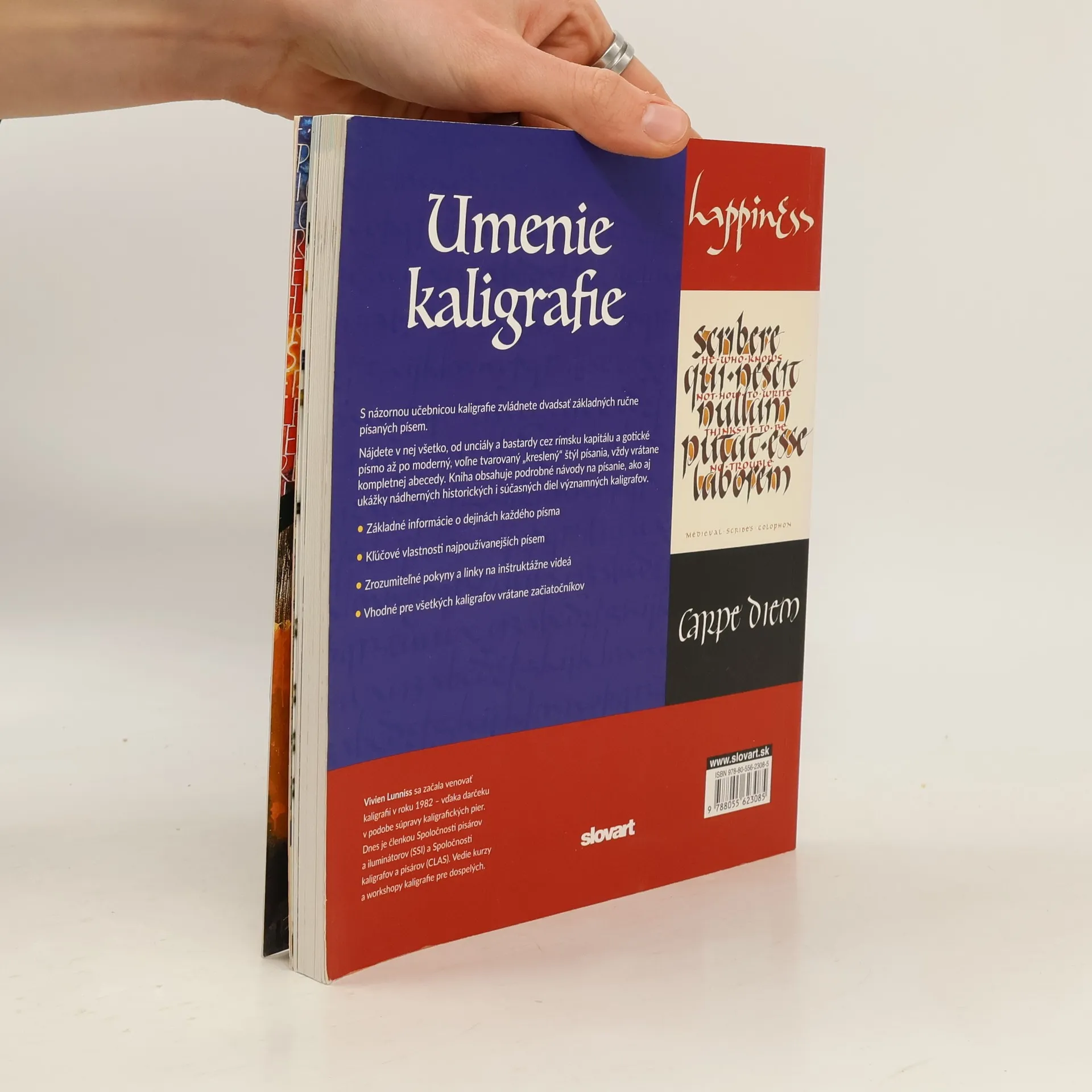 Praktické využitie kaligrafie je zjavné pri pohľade na akúkoľvek pozvánku, diplom či plagát. Toto umenie však ponúka oveľa viac než len rukou písaný text lahodiaci oku. Milovníkom histórie sprostredkúva zaujímavý pohľad na dejiny našej civilizácie a praktizujúcich súčasníkov vedie k trpezlivosti, sústredeniu a zmyslu pre proporciu. Vďaka tejto učebnici kaligrafie zvládnete aj vy dvadsaťjeden základných ručne písaných písem. Knižka obsahuje podrobné návody na písanie najpoužívanejších písem, linky na inštruktážne videá, ako aj ukážky nádherných diel významných kaligrafov. Je vhodná pre všetkých kaligrafov vrátane začiatočníkov.