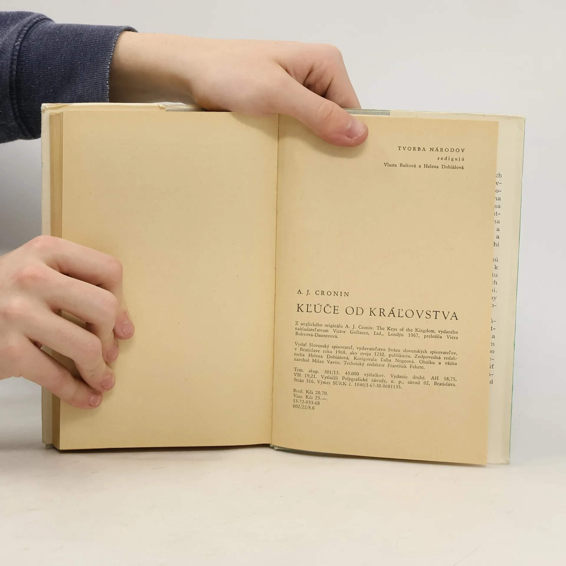 Archibald Joseph CRONIN, známy anglický románopisec, narodený roku 1896 v Škótsku, nie je pôvodným povolaním spisovateľ, ale lekár. Spočiatku pracoval v niekoľkých nemocniciach, potom si otvoril v Južnom Walese súkromnú prax a r. 1924 sa stal zdravotným inšpektorom anglických baní. Sám fáraldo vyše päťsto baní, aby preskúmal tamojšie zdravotné pomery a ochranné zariadenia. Svoje smutné skúsenosti z tohto obdobia spomína v románe Citadela, v diele, ktoré neskôr založilo autorovi svetovú slávu. Croninov kritický tón z Citadely sa však v románe Kľúče od kráľovstva zmenil na zhovievavý a chápavý. Šľachetný misionár Francis Chisholm hľadá v ľuďoch krásu a dobrotu srdca, neposudzuje veriacich podľa príslušnosti k tej či onej cirkvi, lež podľa ich vlastností a skutkov. Pravda, nestretáva sa vždy s pochopením tých, čo lipnú na slove a forme, a dostane sa mu odsúdenia aj od vlastných predstavených, no na druhej strane milujú ho a ctia si ho všetci trpiaci a utláčaní, ľudia jednoduchí a úbohí. Kľúče od kráľovstva sú pre misionára kľúčmi k ľudskej duši a k raju tu na zemi — a dostanú ich všetci, ktorí nie slovami, ale činmi bojujú za to, aby bolo čo najmenej chudobných a nešťastných. Takéto je krédo románu, ktorý svojho času patril k najprekladanejším a najčítanejším anglickým dielam a ktorý vyšiel po vojne aj v slovenčine. Veríme, že naši čitatelia opäť uvítajú nové vydanie tohto úspešného románu od úspešného spisovateľa.