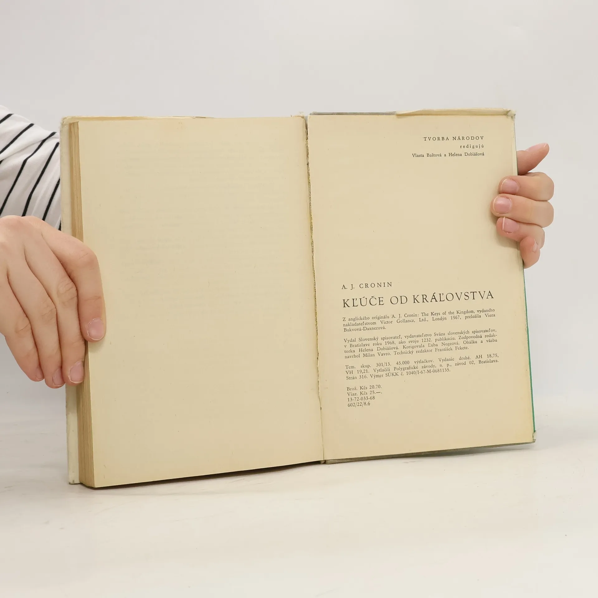 Archibald Joseph CRONIN, známy anglický románopisec, narodený roku 1896 v Škótsku, nie je pôvodným povolaním spisovateľ, ale lekár. Spočiatku pracoval v niekoľkých nemocniciach, potom si otvoril v Južnom Walese súkromnú prax a r. 1924 sa stal zdravotným inšpektorom anglických baní. Sám fáraldo vyše päťsto baní, aby preskúmal tamojšie zdravotné pomery a ochranné zariadenia. Svoje smutné skúsenosti z tohto obdobia spomína v románe Citadela, v diele, ktoré neskôr založilo autorovi svetovú slávu. Croninov kritický tón z Citadely sa však v románe Kľúče od kráľovstva zmenil na zhovievavý a chápavý. Šľachetný misionár Francis Chisholm hľadá v ľuďoch krásu a dobrotu srdca, neposudzuje veriacich podľa príslušnosti k tej či onej cirkvi, lež podľa ich vlastností a skutkov. Pravda, nestretáva sa vždy s pochopením tých, čo lipnú na slove a forme, a dostane sa mu odsúdenia aj od vlastných predstavených, no na druhej strane milujú ho a ctia si ho všetci trpiaci a utláčaní, ľudia jednoduchí a úbohí. Kľúče od kráľovstva sú pre misionára kľúčmi k ľudskej duši a k raju tu na zemi — a dostanú ich všetci, ktorí nie slovami, ale činmi bojujú za to, aby bolo čo najmenej chudobných a nešťastných. Takéto je krédo románu, ktorý svojho času patril k najprekladanejším a najčítanejším anglickým dielam a ktorý vyšiel po vojne aj v slovenčine. Veríme, že naši čitatelia opäť uvítajú nové vydanie tohto úspešného románu od úspešného spisovateľa.