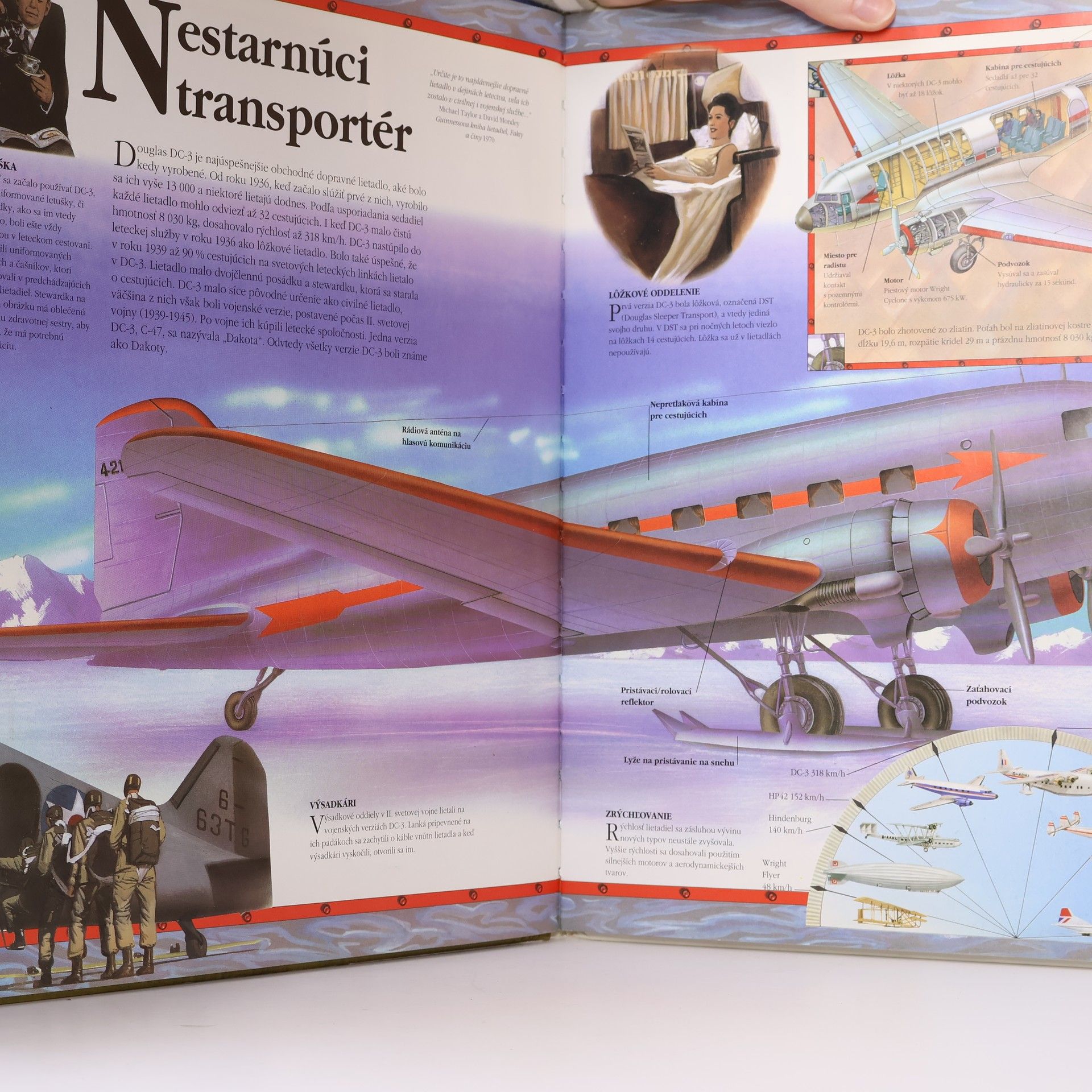 Kapitoly: Čo je lietadlo ?, Vývoj a použitie lietadiel, Prvý let, Plátno a lano, Lietajúci banán, Vzducholoď, Lietajúci čln, Nestarnúci transportér, Obávaná stíhačka, Bombardovanie, Kráľovná aerolínií, Vyššie a rýchlejšie, Mohutná obluda, Vrtuľník, Špionážne lietadlo, Harrier, Rýchlejší než zvuk, Nočný jastrab, Ohnivý vták.