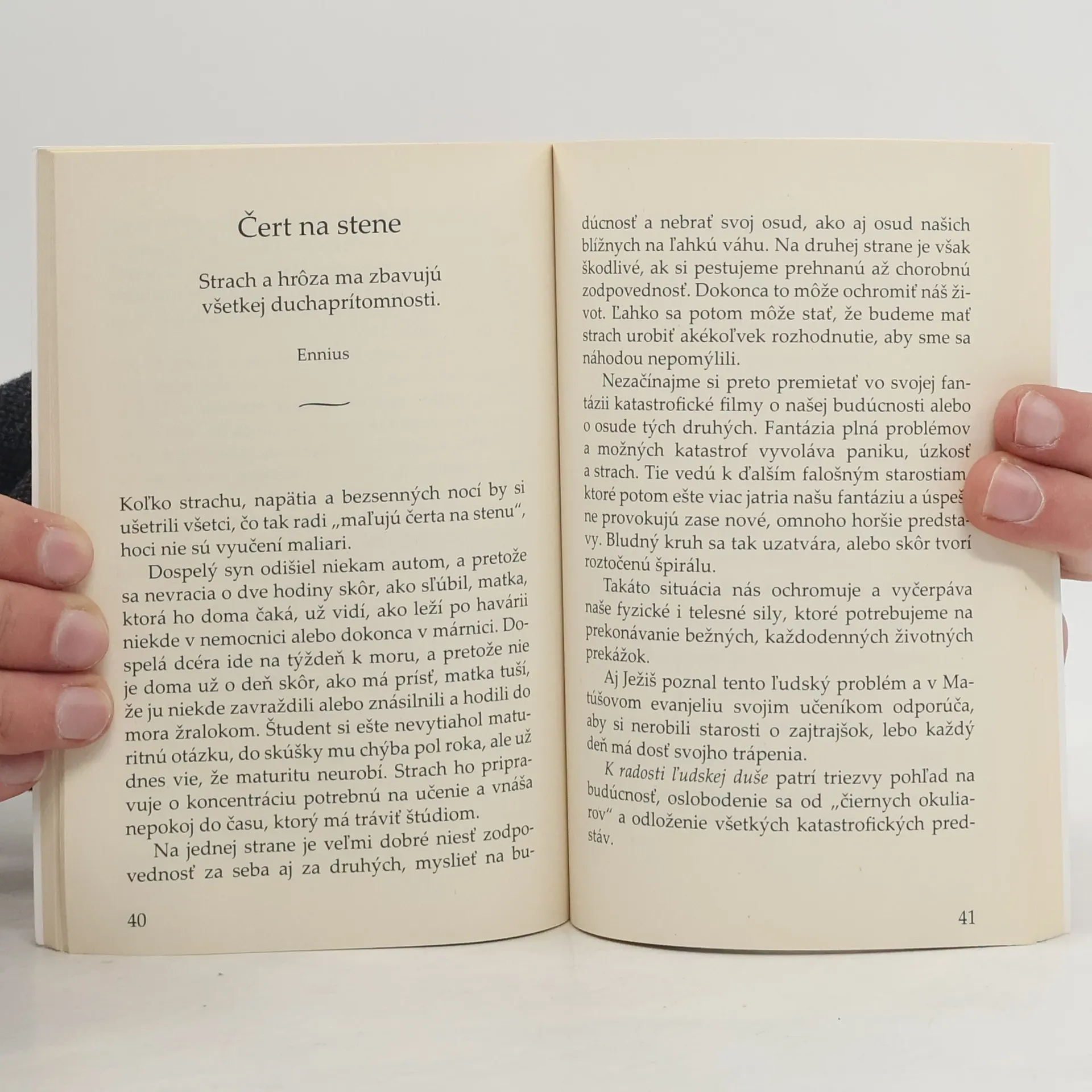 Úvahy vzdelaného psychiatra sú krátke a priamo triafajú „do živého“. Nútia v kaž­dej kapitole čitateľa rozmýšľať nad sebou, nad svojím životom a jeho smerovaním. Upozorňuje nás na radosť, ktorú si bežne ani neuvedomujeme a tým sa ochudobňujeme. Autor nás upozorňuje, že zmeniť to, je v našich silách. Druhé, nezmenené vydanie