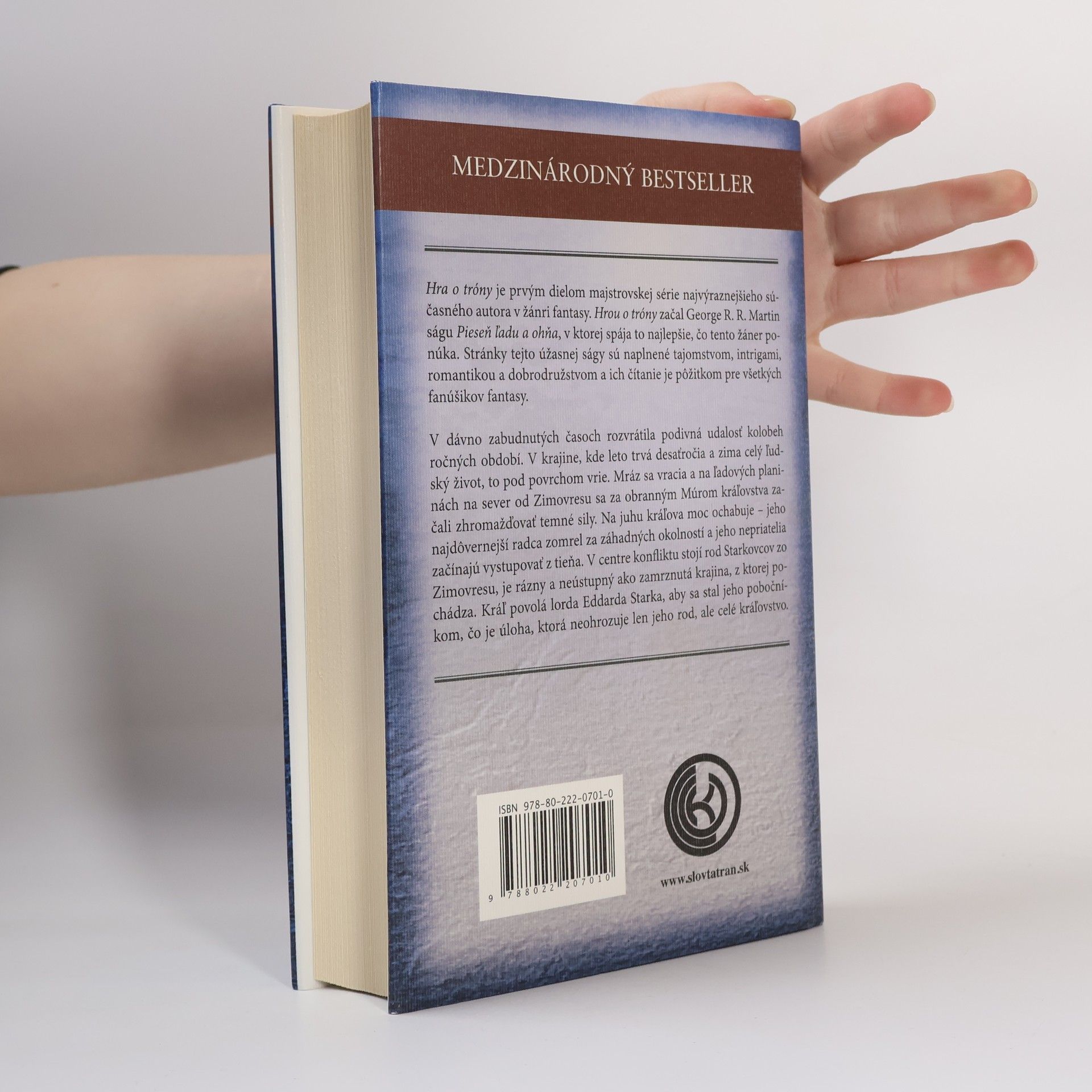 Hra o tróny rozpráva príbeh, ktorý prechádza z krutej krajiny ľadu do letného kráľovstva epikurejského bohatstva, kde sa rozpletajú osudy lordov a dám, vojakov a čarodejníkov, vrahov a zloduchov, stretávajúce sa v časoch zlovestných znamení. Záhadná skupina bojovníkov s mečmi z neznámeho kovu, kmeň divochov, privádzajúci ľudí do šialenstva, krutý dračí princ, ktorý vymení svoju sestru za trón, dieťa strácajúce sa v súmraku medzi životom a smrťou a odhodlaná žena, ktorá sa vydáva na zradnú cestu, aby ochránila všetko, čo je jej drahé. Uprostred celého tohto diania, príbehov plných tragédií aj zrady, spojencov aj nepriateľov visí osud rodu Starkovcov na vlásku. Z každej strany čelia útokom a snažia sa zvíťaziť v najkrutejšej z bitiek – v hre o tróny.