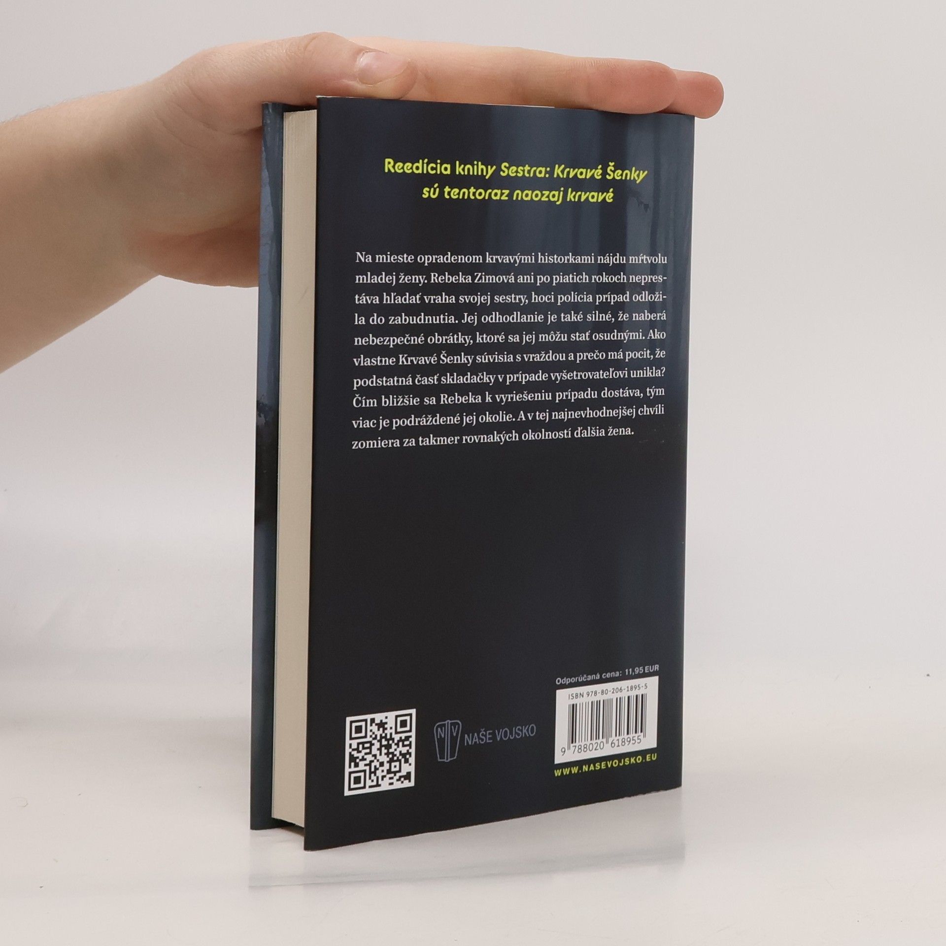 Na mieste opradenom krvavými historkami nájdu mŕtvolu mladej ženy. Rebeka Zimová ani po piatich rokoch neprestáva hľadať vraha svojej sestry, hoci polícia prípad odložila do zabudnutia. Jej odhodlanie naberá nebezpečné obrátky. Ako Krvavé Šenky súvisia s vraždou Karin Zimovej a prečo má Rebeka neodbytný pocit, že podstatná časť skladačky v prípade vyšetrovateľovi unikla? Čím bližšie sa k vyriešeniu prípadu dostáva, tým viac je podráždené jej okolie. A v tej najnevhodnejšej chvíli zomiera za takmer rovnakých okolností ďalšia žena...