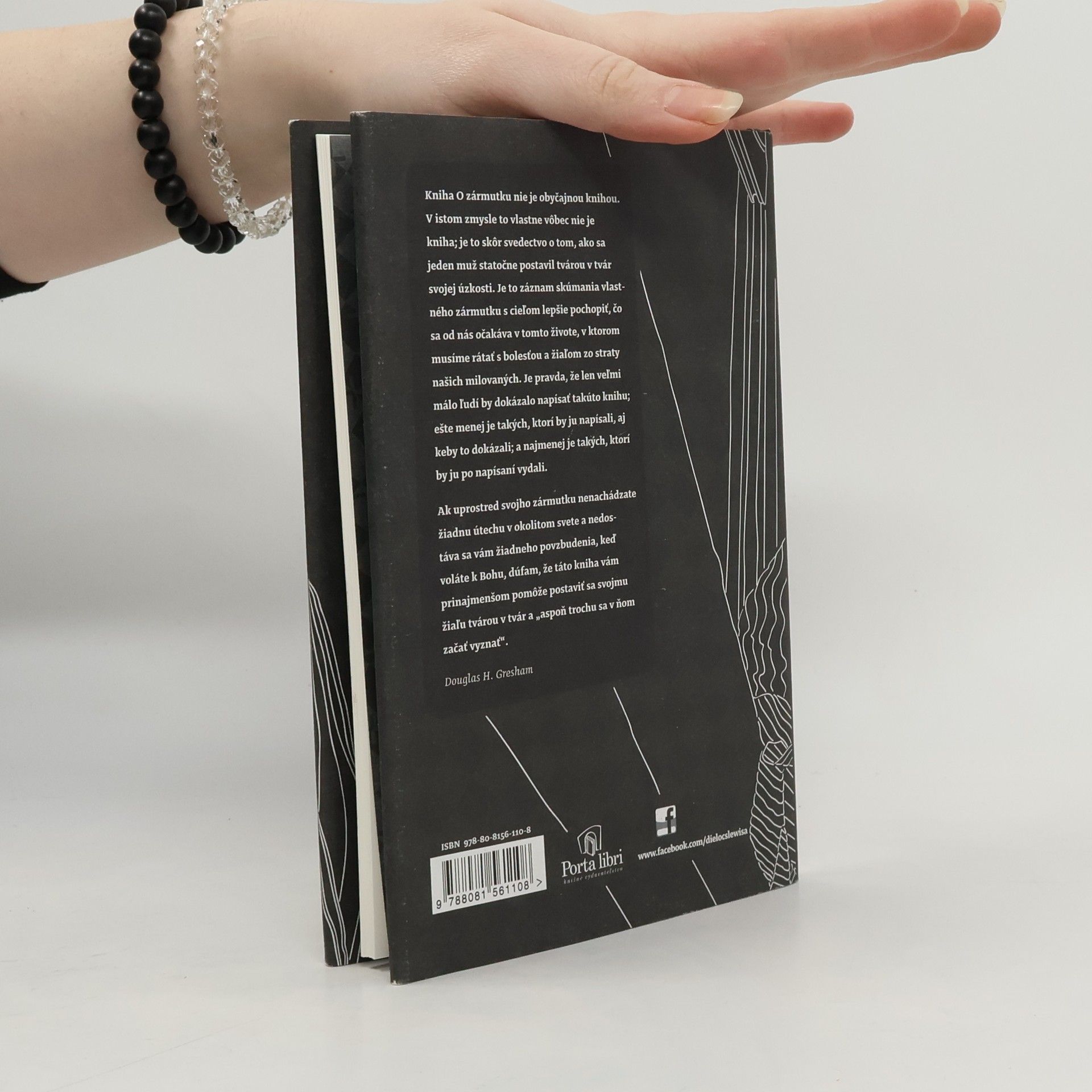 Kniha O zármutku nie je obyčajnou knihou. V istom zmysle to vlastne vôbec nie je kniha; je to skôr svedectvo o tom, ako sa jeden muž statočne postavil tvárou v tvár svojej úzkosti. Je to záznam skúmania vlastného zármutku s cieľom lepšie pochopiť, čo sa od nás očakáva v tomto živote, v ktorom musíme rátať s bolesťou a žiaľom zo straty našich milovaných. Je pravda, že len veľmi málo ľudí by dokázalo napísať takúto knihu; ešte menej je takých, ktorí by ju napísali, aj keby to dokázali; a najmenej je takých, ktorí by ju po napísaní vydali. Ak uprostred svojho zármutku nenachádzate žiadnu útechu v okolitom svete a nedostáva sa vám žiadneho povzbudenia, keď voláte k Bohu, dúfam, že táto kniha vám prinajmenšom pomôže postaviť sa svojmu žiaľu tvárou v tvár a „aspoň trochu sa v ňom začať vyznať“. Douglas H. Gresham