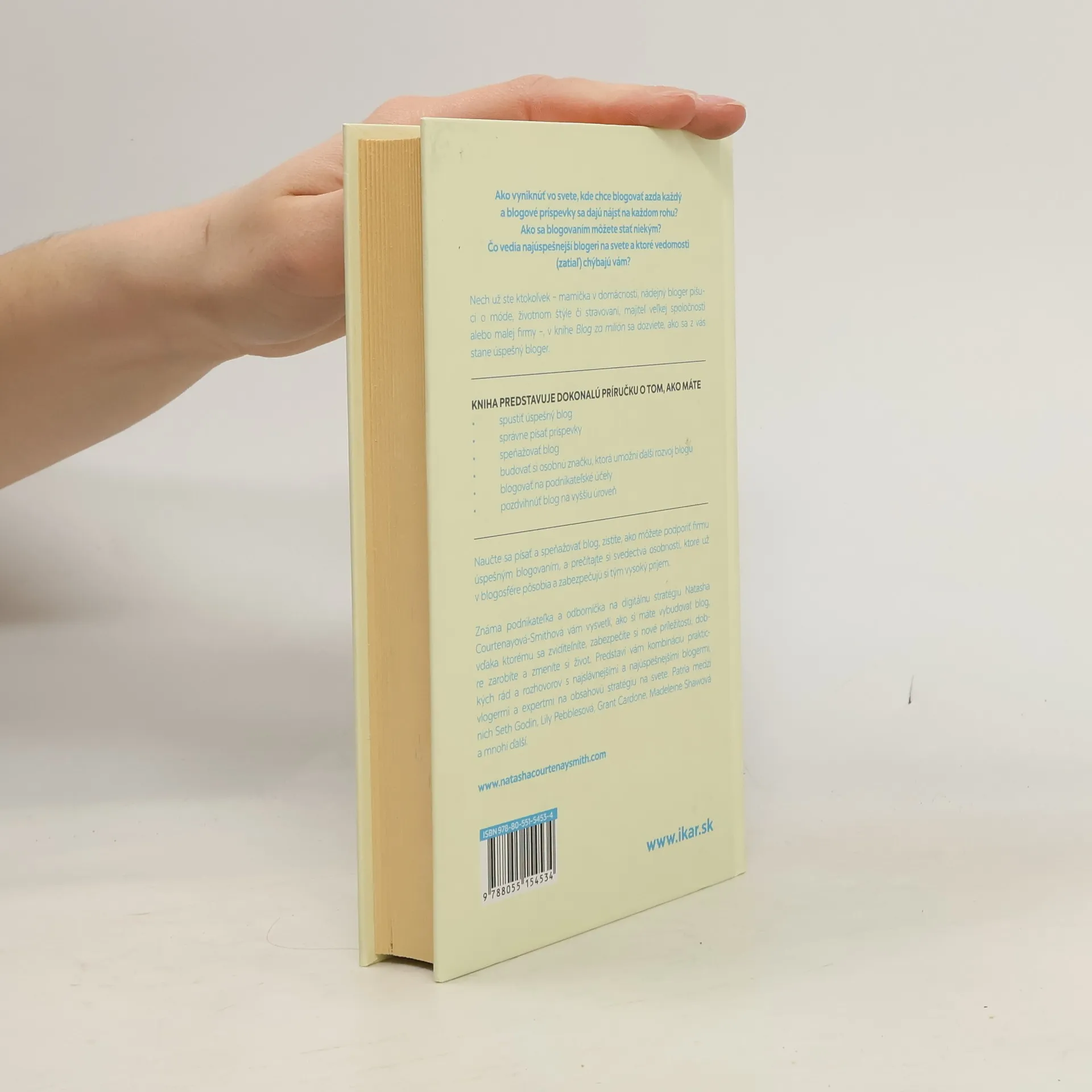 Ako vyniknúť vo svete, kde chce blogovať azda každý a blogové príspevky sa dajú nájsť na každom rohu? Ako sa blogovaním môžete stať niekým? Čo vedia najúspešnejší blogeri na svete a ktoré vedomosti (zatiaľ) chýbajú vám? Nech už ste ktokoľvek – mamička v domácnosti, nádejný bloger píšuci o móde, životnom štýle či stravovaní, majiteľ veľkej spoločnosti alebo malej firmy –, v knihe Blog za milión sa dozviete, ako sa z vás stane úspešný bloger. Kniha predstavuje dokonalú príručku o tom, ako máte • spustiť úspešný blog • správne písať príspevky • speňažovať blog • budovať si osobnú značku, ktorá umožní ďalší rozvoj blogu • blogovať na podnikateľské účely • pozdvihnúť blog na vyššiu úroveň Naučte sa písať a speňažovať blog, zistite, ako môžete podporiť firmu úspešným blogovaním, a prečítajte si svedectvá osobností, ktoré už v blogosfére pôsobia a zabezpečujú si tým vysoký príjem. Podnikateľka a odborníčka na digitálnu stratégiu Natasha Courtenayová-Smithová vám vysvetlí, ako si máte vybudovať blog, vďaka ktorému sa zviditeľníte, zabezpečíte si nové príležitosti, dobre zarobíte a zmeníte si život. Predstaví vám kombináciu praktických rád a rozhovorov s najslávnejšími a najúspešnejšími blogermi, vlogermi a expertmi na obsahovú stratégiu na svete. Patria medzi nich Seth Godin, Lily Pebblesová, Grant Cardone, Madeleine Shawová a mnohí ďalší.