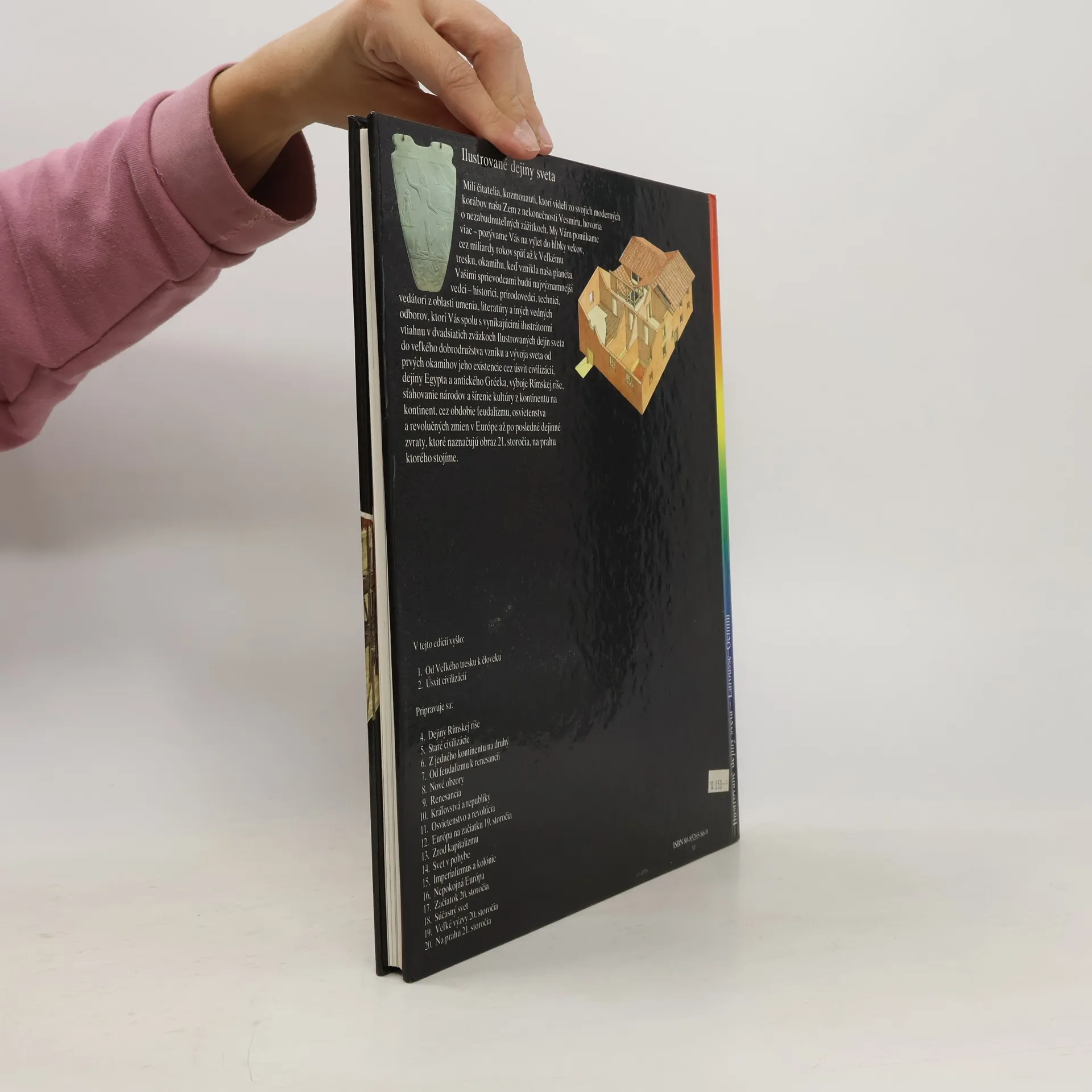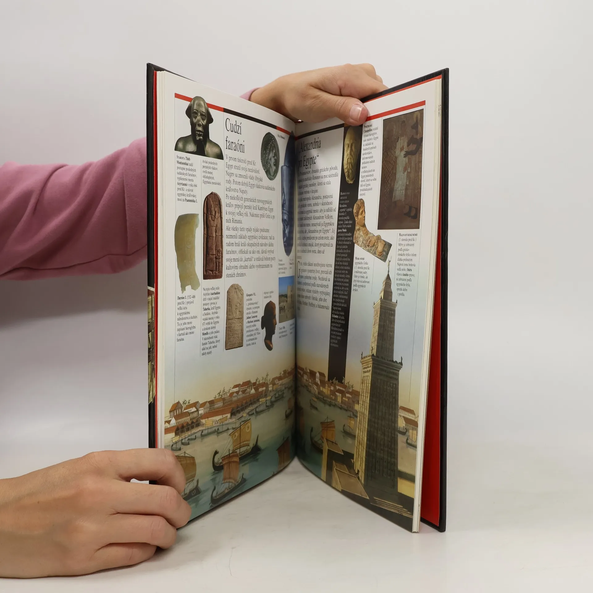 Kapitoly: Všedný život v Egypte-Egypt a Níl, Pred faraónmi, Faraón, vládca Egypta, Pohrebné zvyky v Starej ríši, Stavba pyramíd, Ročné obdobia, Plavba na Níle, Život veľmožov, Veľké dynastie. Viera a materiálny život v Egypte-Egypt a jeho susedia, Dielne a sklady, Egyptskí bohovia, Sochárstvo, Apetin sviatok, Khaova hrobka, Pohrebné obrady, Zrod egyptológie. Vojenské umenie a veda v Egypte-Armáda a Nová ríša, Ramesse III. a "morské národy", Dôležitá osobnosť: vezír, Život v paláci v Amarne, Vedy, Hieroglyfický systém, Cudzí faraóni, "Alexandria pri Egypte", Egyptská archeológia. Prví Gréci-Egejský svet, Knóssos, Minojská civilizácia, Sviatky a hry v Knósse, Katastrofa Théry, Mykény, Obliehanie Tróje, "Posadnutý" Homérom, Písmo. Grécke mestské štáty-Kolonizácia, Orientalizujúce umenie, Tyranis, Archaické umenie, Hrnčiarstvo, Aténska demokracia, Akropola, Thermopyly, Grécky chrám, Divadlo, Bohovia. Od Perikla po Alexandra-Sviatky v Attike, Všedný život, Olympijské hry, Spracovanie bronzu, Vedy a filozofia, Vergma, Alexandrova ríša, Sedem divov sveta. Prvé vydanie.