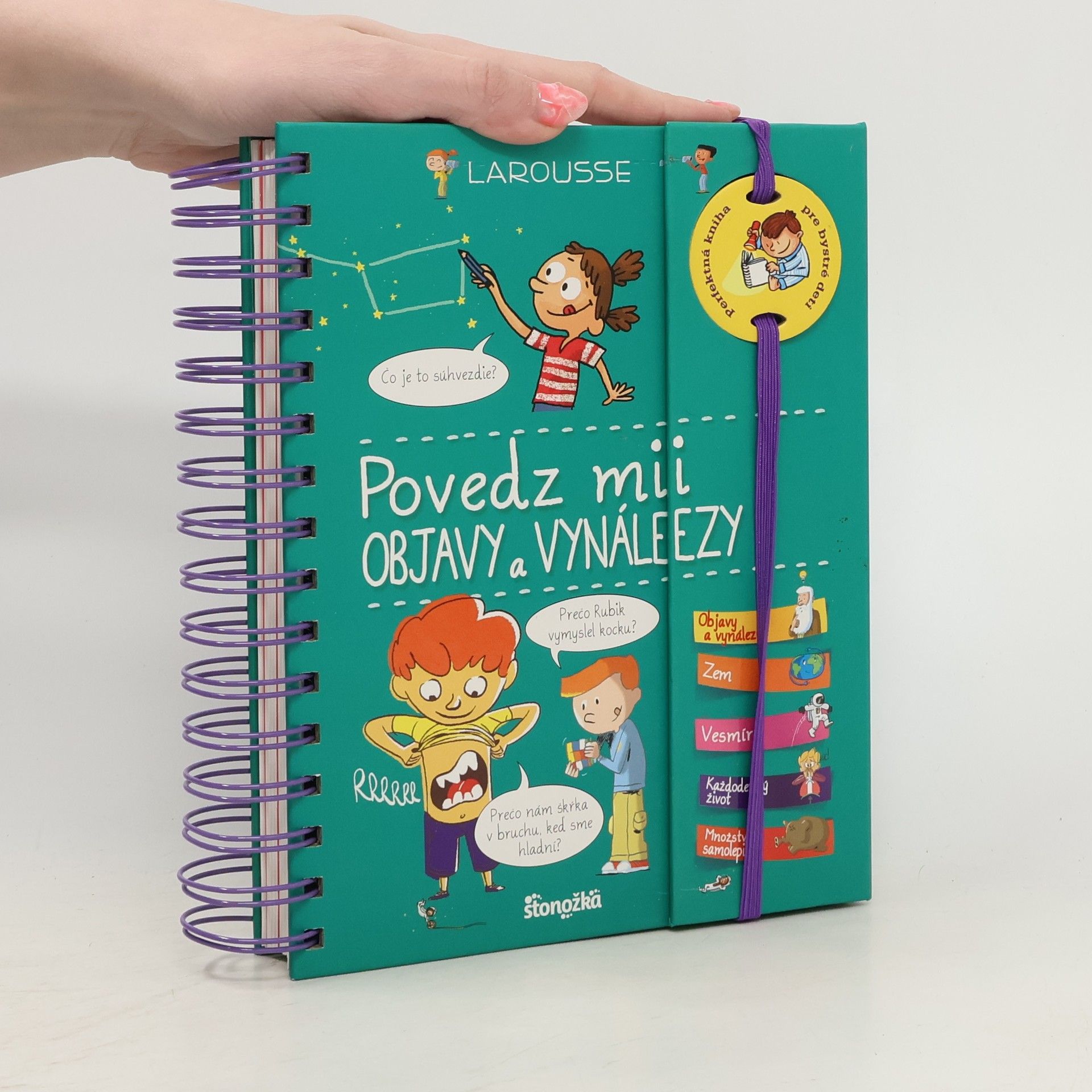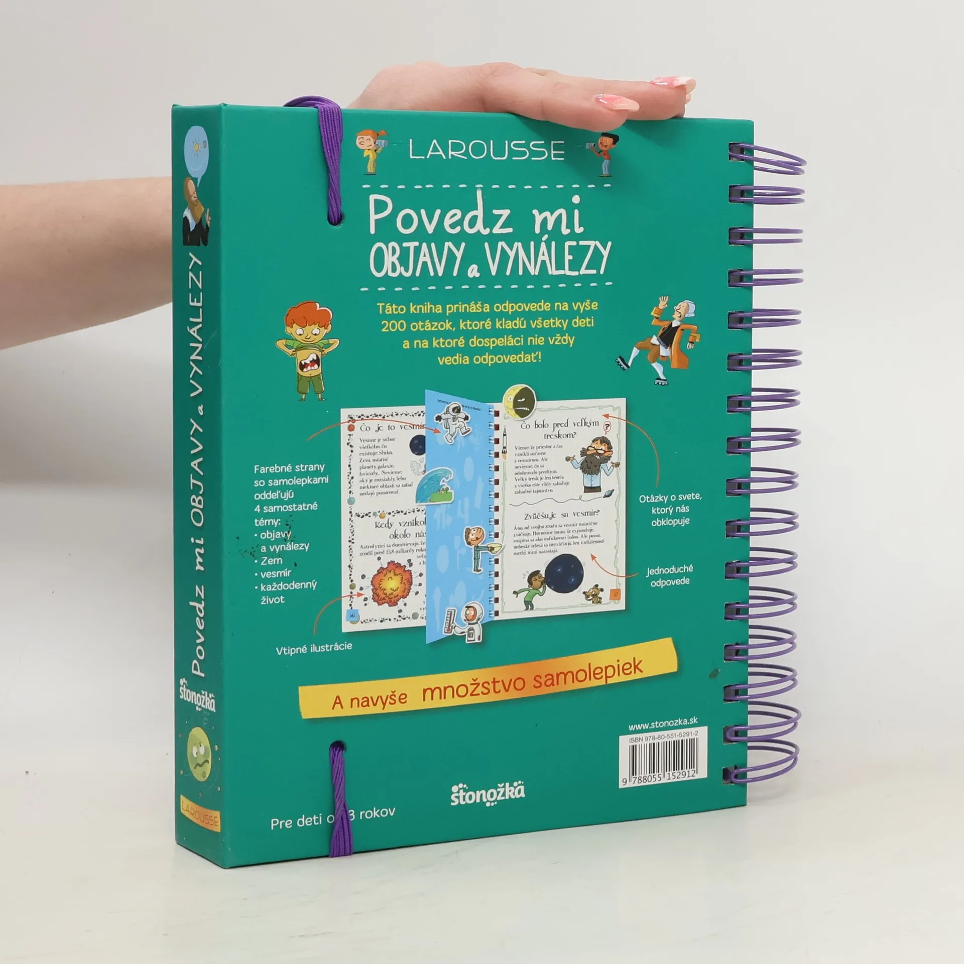 Táto kniha prináša odpovede na vyše 200 otázok, ktoré kladú všetky deti a na ktoré dospeláci nie vždy vedia odpovedať! Farebné strany so samolepkami oddeľujú 4 samostatné témy: – vynálezy – Zem – vesmír – každodenný život Vtipné ilustrácie. Otázky o svete, ktorý nás obklopuje. Jednoduché odpovede. A navyše množstvo samolepiek!