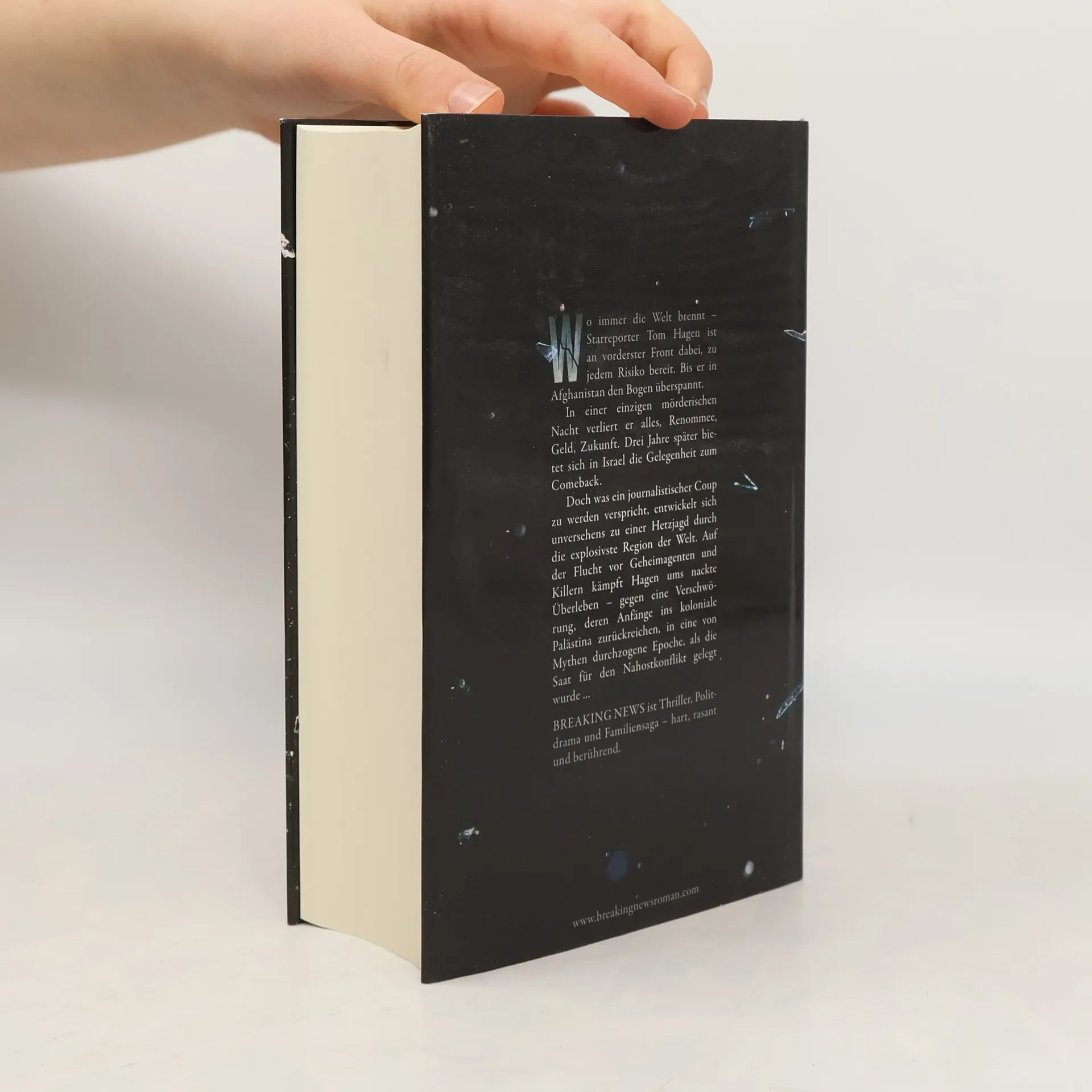 Thriller, Politdrama und Familiensaga – hart, rasant und berührend. Tom Hagen, gefeierter Star unter den Krisenberichterstattern, ist nicht zimperlich, wenn es um eine gute Story geht. Die Länder des Nahen Ostens sind sein Spezialgebiet, seine Reportagen Berichte aus der Hölle. Doch in Afghanistan verlässt ihn sein Glück. Eine nächtliche Geiselbefreiung endet im Desaster. Hagens Ruf ist ruiniert, verzweifelt kämpft er um sein Comeback. Drei Jahre später bietet sich die Gelegenheit in Tel Aviv, als ihm Daten des israelischen Inlandgeheimdienstes zugespielt werden. Hagen ergreift die Chance - und setzt ungewollt eine tödliche Kettenreaktion in Gang... Breaking News ist ein mitreißender Thriller vor dem Hintergrund einer epischen Saga. Zwei Familien wandern Ende der zwanziger Jahre nach Palästina ein – in eine von Legenden, Kämpfen und Hoffnungen beherrschte neue Welt, wo Juden, Araber und britische Kolonialherren erbittert um die Vorherrschaft ringen. Bis in die Gegenwart, über Generationen hinweg, spiegeln und prägen beide Familien Israels atemlose Entwicklung. Als Hagen in der jungen Ärztin Yael Kahn eine unerwartete Verbündete findet, erkennt er, dass auch sein Schicksal eng mit der Geschichte des Landes verbunden ist. Doch mit Yael an seiner Seite gehen die Probleme erst richtig los.