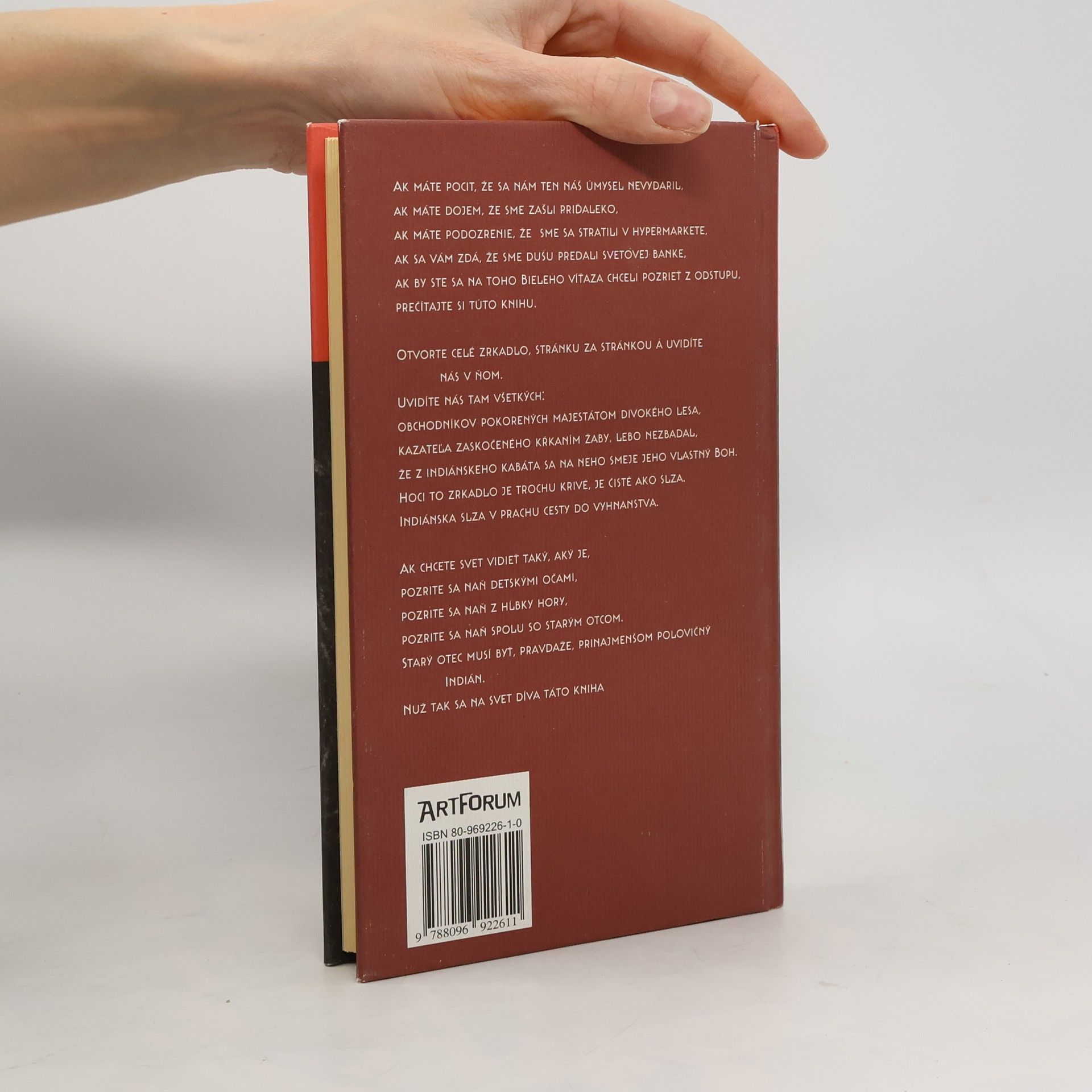 Ak máte pocit, že sa nám ten náš úspech nevydaril., ak máte dojem, že sme zašli priďaleko, ak máte podozrenie, že sme sa stratili v hyperrmarkete, ak sa vám zdá, že sme dušu predali svetovej banke, ak by ste sa na toho Bieleho víťaza chceli pozrieť z odstupu, prečítajte si túto knihu. Otvorte celé zrkadlo, stránku za stránkou a uvidíte nás v ňom Uvidíte nás tam všetkých: Obchodníkov pokorených majestátom divokého lesa. Kazateľa zaskočeného kŕkaním žaby, lebo nezbadal, že z indiánskeho kabáta sa na neho smeje jeho vlastný Boh. Hoci to zrkadlo je trochu krivé, je čisté ako slza. Indiánska slza v prachu cesty do vyhnanstva. Ak chcete svet vidieť taký aký je, pozrite sa naň detskými očami, pozrite sa naň z hĺbky hory pozrite sa naň spolu so starým otcom. Starý otec musí byť pravdaže prinajmenšom polovičný Indián. Nuž tak sa na svet díva táto kniha