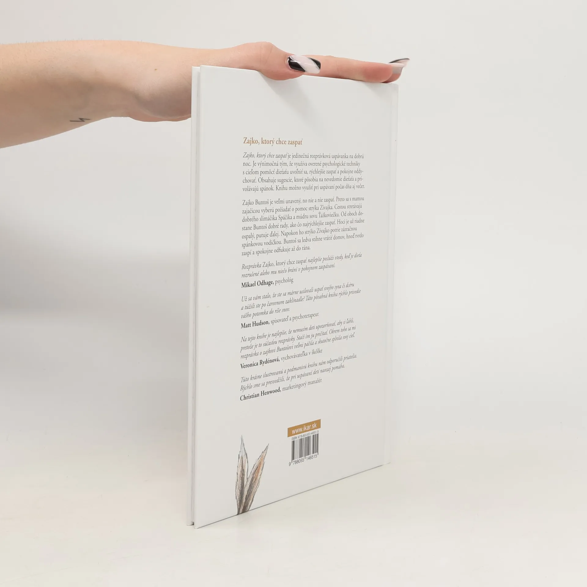 Zajko, ktorý chce zaspať je jedinečná rozprávka na dobrú noc. Je výnimočná tým, že využíva overené psychologické techniky, ktorých cieľom je pomôcť dieťaťu uvoľniť sa, rýchlejšie zaspať a pokojne spávať. Rozprávka obsahuje sugescie, ktoré pôsobia na nevedomie dieťaťa a privolávajú spánok. Knihu možno využiť pri uspávaní počas dňa aj večer. V príbehu budete sledovať zajka Tomáša, ktorý je veľmi unavený, ale nemôže zaspať. Preto sa spolu s mamou zajačicou vyberie požiadať o pomoc strýka Zívajka. Cestou stretávajú dobrého slimáčika Spáčika a múdru sovu Ťažkoviečku. Od oboch dostane Tomáš dobré rady, ako čo najrýchlejšie zaspať. Hoci je čoraz ospalejší, putuje ďalej. Strýko Zívajko potrie Tomáša zázračnou spánkovou tinktúrou. Tomáš sa ledva stihne vrátiť domov, hneď zaspí tým najtvrdším spánkom až do rána.