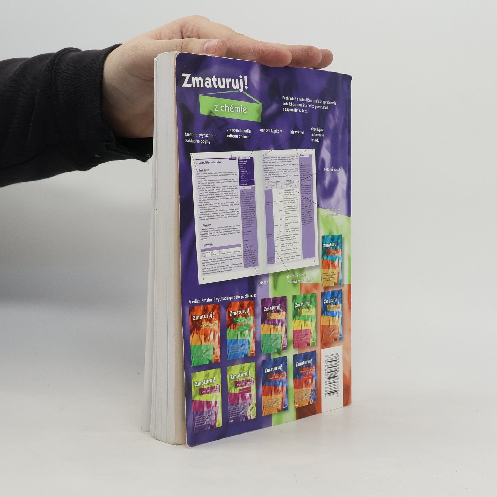 Publikácia podáva prehľadne usporiadané učivo chémie v rozsahu osnov strednej školy. Čitateľa postupne zoznámi s poznatkami zo všeobecnej chémie, anorganickej a organickej chémie, biochémie a tiež termochémie. Porozumenie a zapamätanie učiva podporujú prehľadné tabuľky a názorné schémy, text je doplnený aj príkladmi chemických výpočtov. Orientáciu v texte zjednodušuje členenie učiva na kapitoly a menšie tematické celky i abecedný register pojmov. Prehľadná a svieža grafická úprava uľahčí a spríjemní učenie. Publikácia je určená študentom stredných škôl, ktorí ju využijú počas celého stredoškolského štúdia, na prípravu na maturitu a tiež na prijímacie skúšky na vysoké školy.