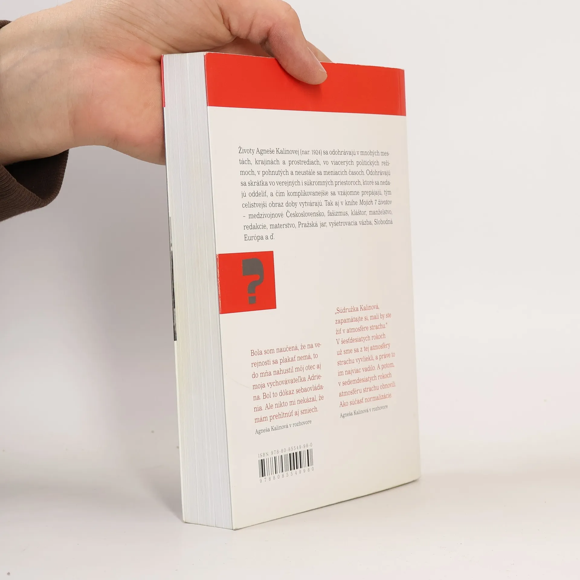 Knižný rozhovor so známou tvárou Kultúrneho života a Slobodnej Európy – novinárkou, redaktorkou, prekladateľkou a filmovou i politickou publicistkou Agnešou Kalinovou je prvou publikáciou nového radu Rozhovory ASPEKTU. S Agnešou Kalinovou sa zhovárala Jana Juráňová, aby si pre seba aj pre nás „zopakovala“ vraj krátke, ale o to úmornejšie 20. storočie.