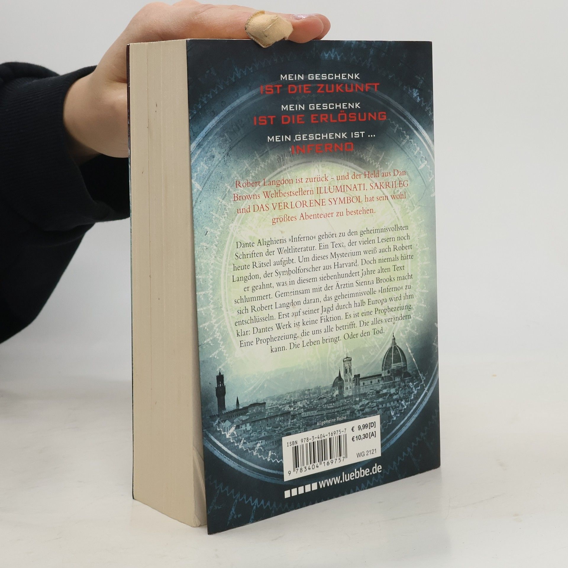 Robert Langdon, Harvard-Professor für Symbologie, erwacht mit einer Schusswunde in einem Krankenhaus in Florenz und hat keine Erinnerung an die letzten zwei Tage. Nach einem Anschlag flieht er mit der jungen Ärztin Sienna Brooks in deren Wohnung. Dort entdeckt er, dass er an der Entschlüsselung einer versteckten Botschaft in einem jahrhundertealten Gemälde zu Dantes „Inferno“ gearbeitet hat. Die Spur führt sie in den Palazzo Vecchio, wo sie sich von Dantes Totenmaske konkrete Hinweise erhoffen, doch diese wurde gestohlen. Langdon und Brooks müssen nun durch halb Europa jagen, um die Maske wiederzufinden und einen perfiden Plan zu vereiteln. Dan Brown, 1964 in New Hampshire geboren, studierte Englisch und Spanisch, bevor er sich Mitte der 90er Jahre ganz dem Schreiben widmete. Sein erster Roman, „Diabolus“, erschien 1998, doch der große Durchbruch kam 2000 mit „Illuminati“, dem ersten Thriller um Langdon. Brown kombiniert geschickt Thriller-Elemente mit religions- und kunsthistorischen Fakten, was ihm ein breites Publikum sichert. Mit diesem Werk präsentiert er den vierten spannenden Thriller um den Symbolologen Robert Langdon.