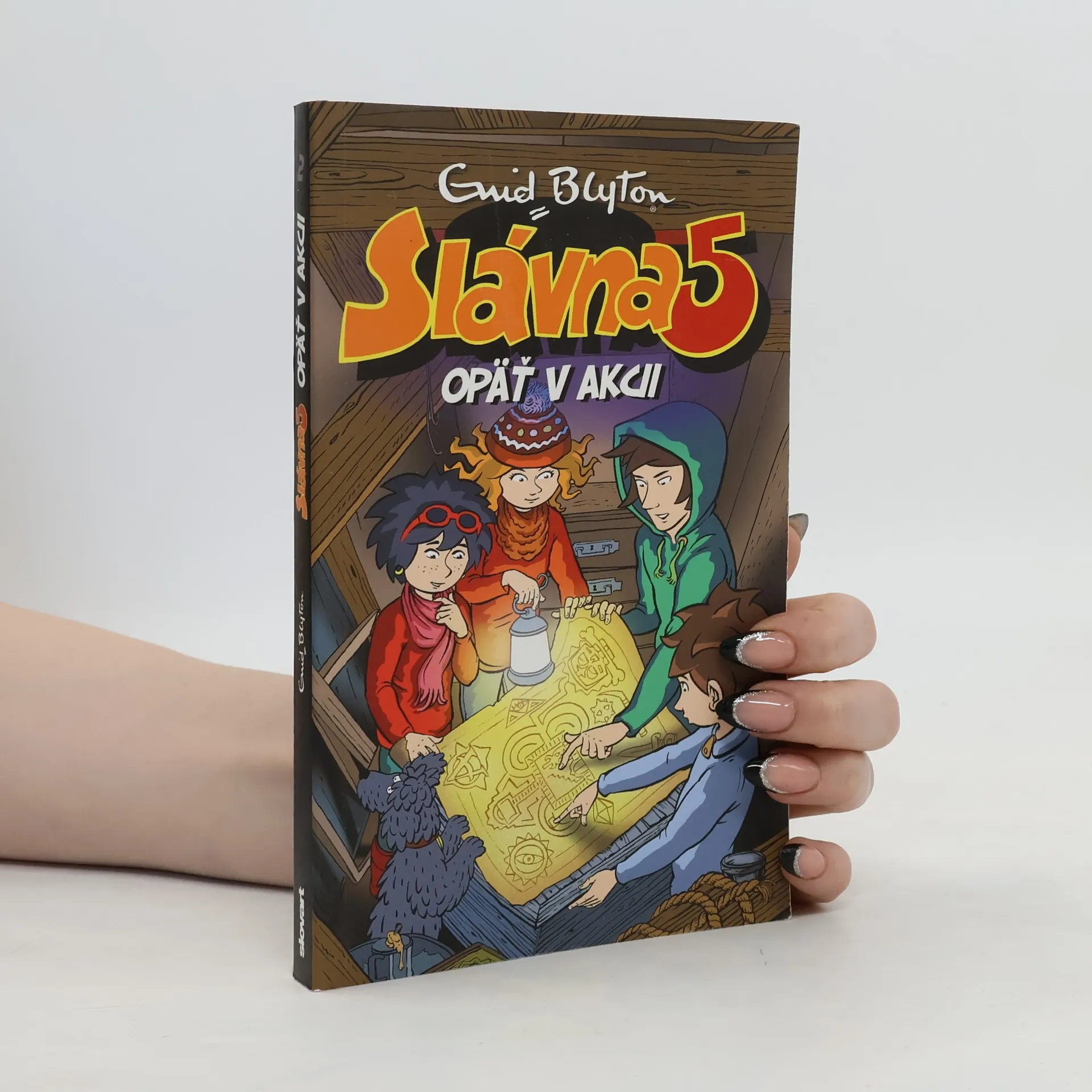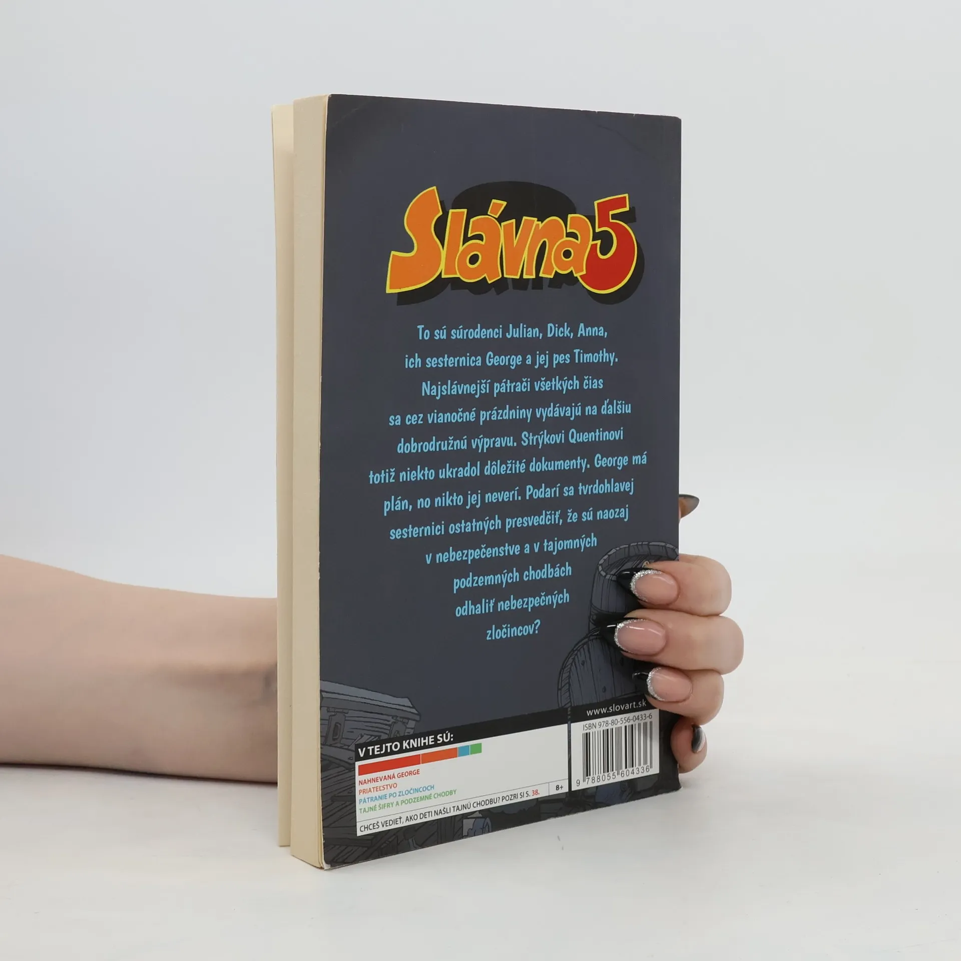 Nové vydanie obľúbenej dobrodružnej série zaujme malých i veľkých. Slávna päťka, to sú v skutočnosti štyri deti a pes. Julian, Dick, George, či vlastne Georgina, Anna a pes Timothy. Čo všetko zažili na pustom ostrove? Aké dobrodružstvo ich postretlo pri plavbe na mori či v noci v zrúcanine starého hradu? Čo objavili v starom potopenom vraku? A ako vyzerá ozajstné hľadanie pokladu?