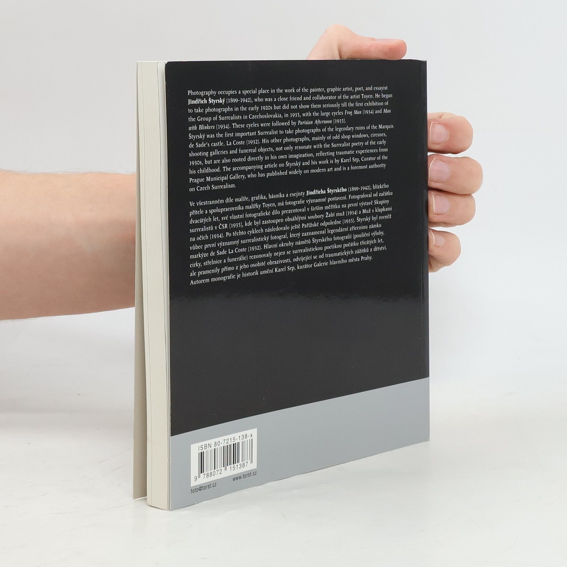 Precizní monografie o Štyrského fotografickém díle představuje slavného surrealistu jako jednoho z nejpozoruhodnějších českých předválečných fotografů. Ve všestranném díle malíře, grafika, básníka a esejisty Jindřicha Štyrského (1899-1942), blízkého přítele a spolupracovníka malířky Toyen, má fotografie významné postavení. Fotografoval od začátku dvacátých let, své vlastní fotografické dílo prezentoval v širším měřítku na první výstavě Skupiny surrealistů v ČSR (1935), kde byl zastoupen obsáhlými soubory Žabí muž (1934) a Muž s klapkami na očích (1934). Po těchto cyklech následovalo ještě Pařížské odpoledne (1935). Štyrský byl rovněž vůbec první významný surrealistický fotograf, který zaznamenal legendární zříceninu zámku markýze de Sade La Coste (1932). Hlavní okruhy námětů Štyrského fotografií (pouliční výlohy, cirky, střelnice a funerálie) rezonovaly nejen se surrealistickou poetikou počátku třicátých let, ale pramenily přímo z jeho osobité obrazivosti, odvíjející se od traumatických zážitků z dětství. Autorem monografie je historik umění Karel Srp, kurátor Galerie hlavního města Prahy.