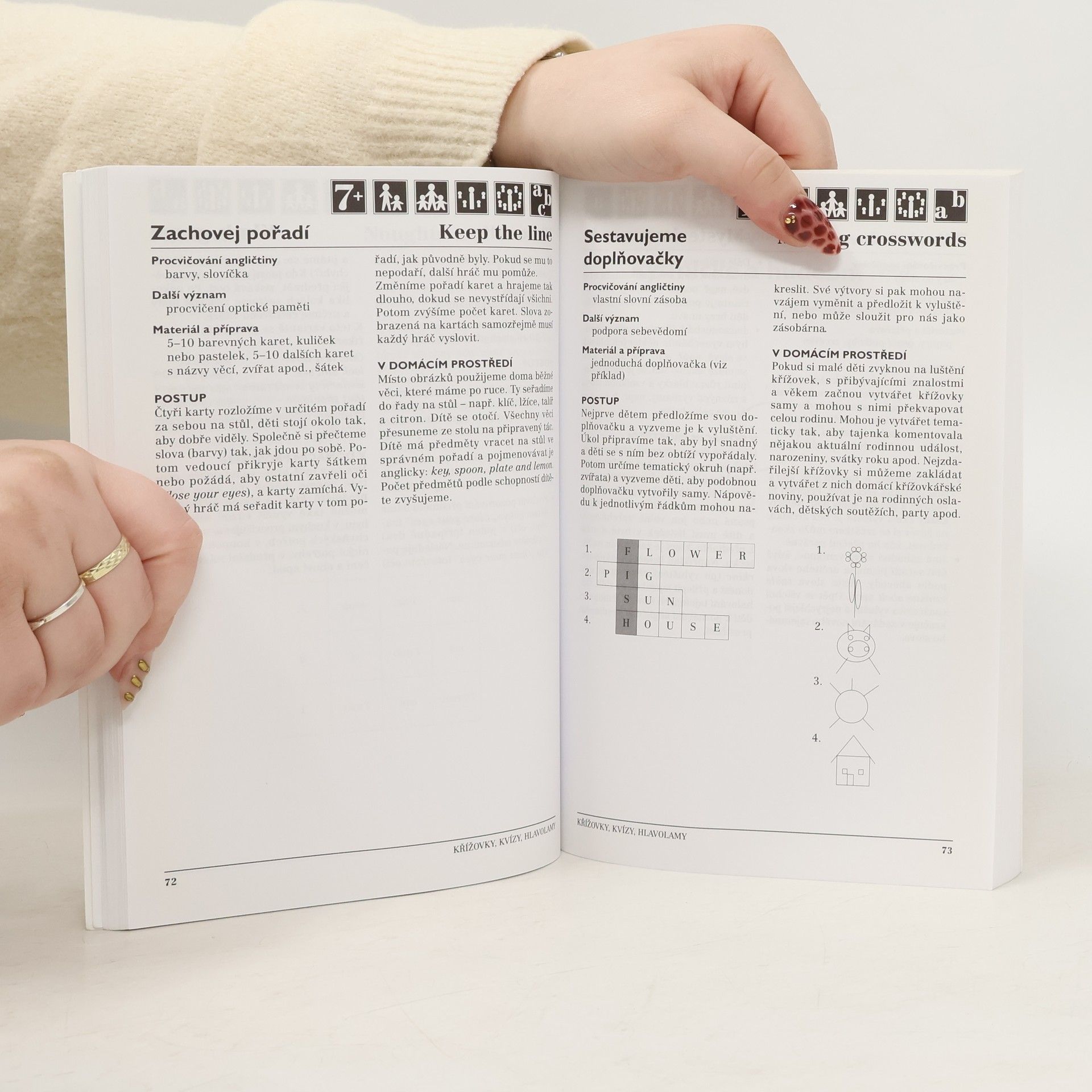 Více než 160 pohybových, dramatických a výtvarných her pro procvičování angličtiny Děti při nich využijí spelování, slovíčka z různých tematických okruhů, základní konverzační obraty a hlavně se naučí angličtině rozumět a používat ji při běžných činnostech. Při pohybu a řešení nejrůznějších úkolů získávají děti jazykové znalosti snadněji a intenzivněji než při "biflování". Právě aktivní radostný přístup k jazyku a využití angličtiny při poznávání všemi smysly i při pohybu považují autorky za nejdůležitější. Činnosti využijí nejen učitelé a vedoucí kroužků anglického jazyka se skupinou dětí, v knize nechybí ani hry pro rodiče s jedním dítětem. U každé hry jsou uvedeny informace důležité při přípravě, témata procvičovaná v angličtině i různé varianty a využití aktivity v domácím prostředí.